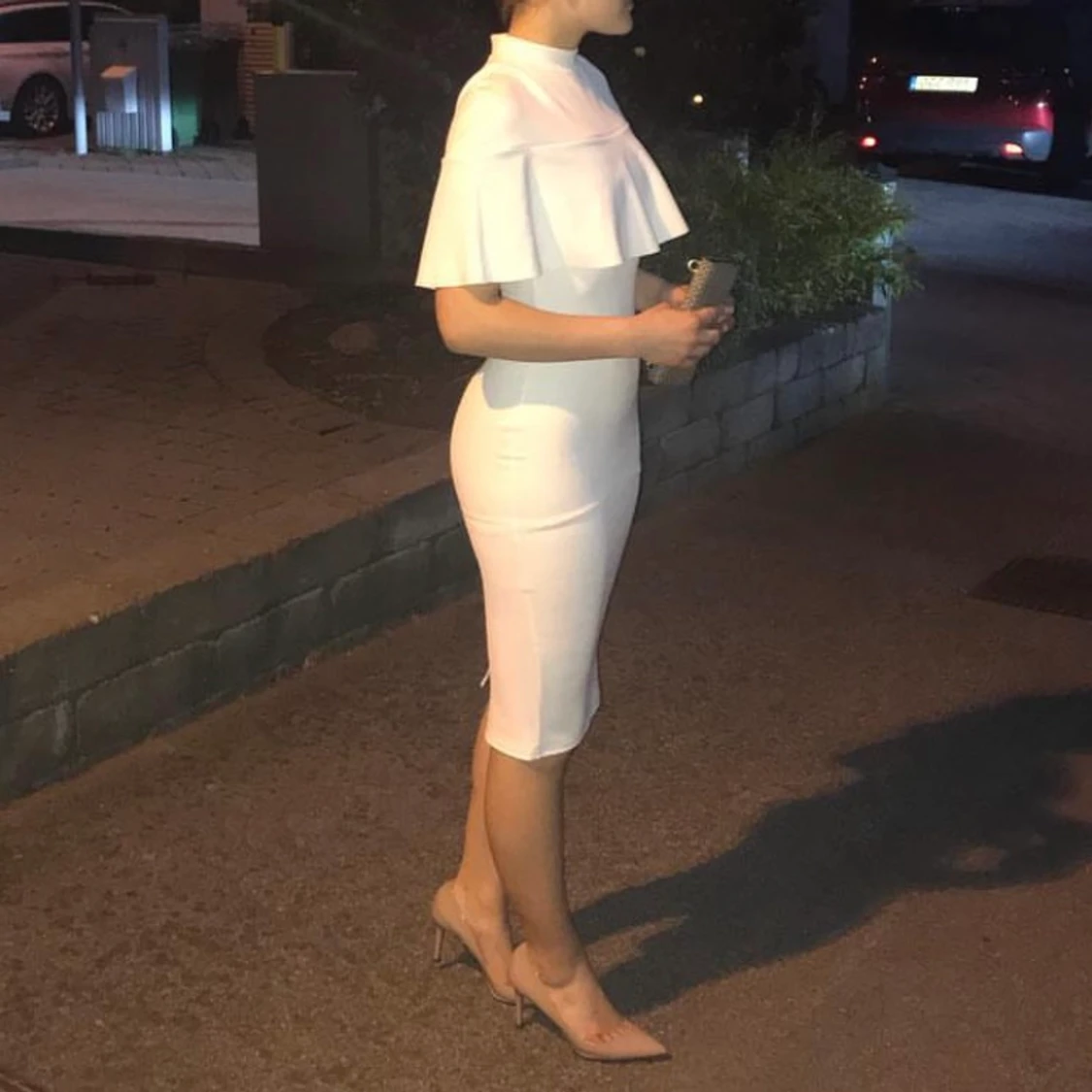 Vit klänning som jag hade på mig bara en gång. Väldigt stretch material. Har inga bilder backifrån men den har en liten slit (10cm kanske) i mitten. Jag är 166cm. ☺️