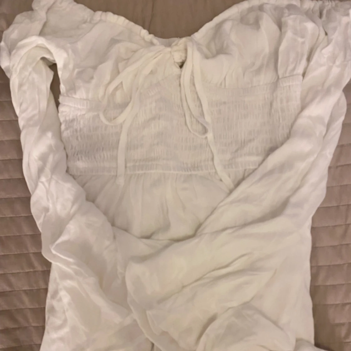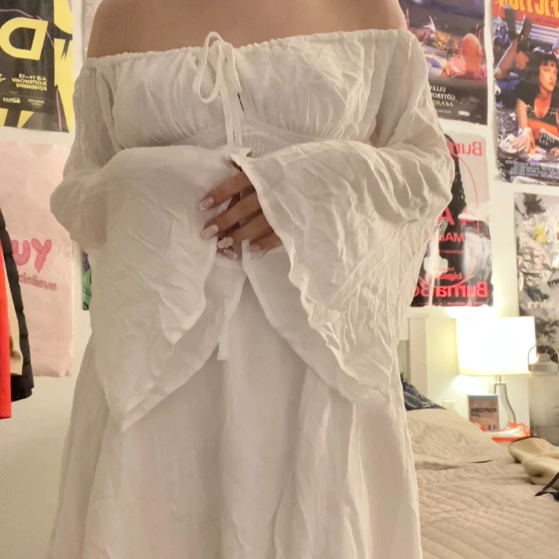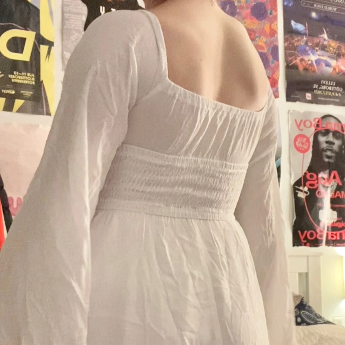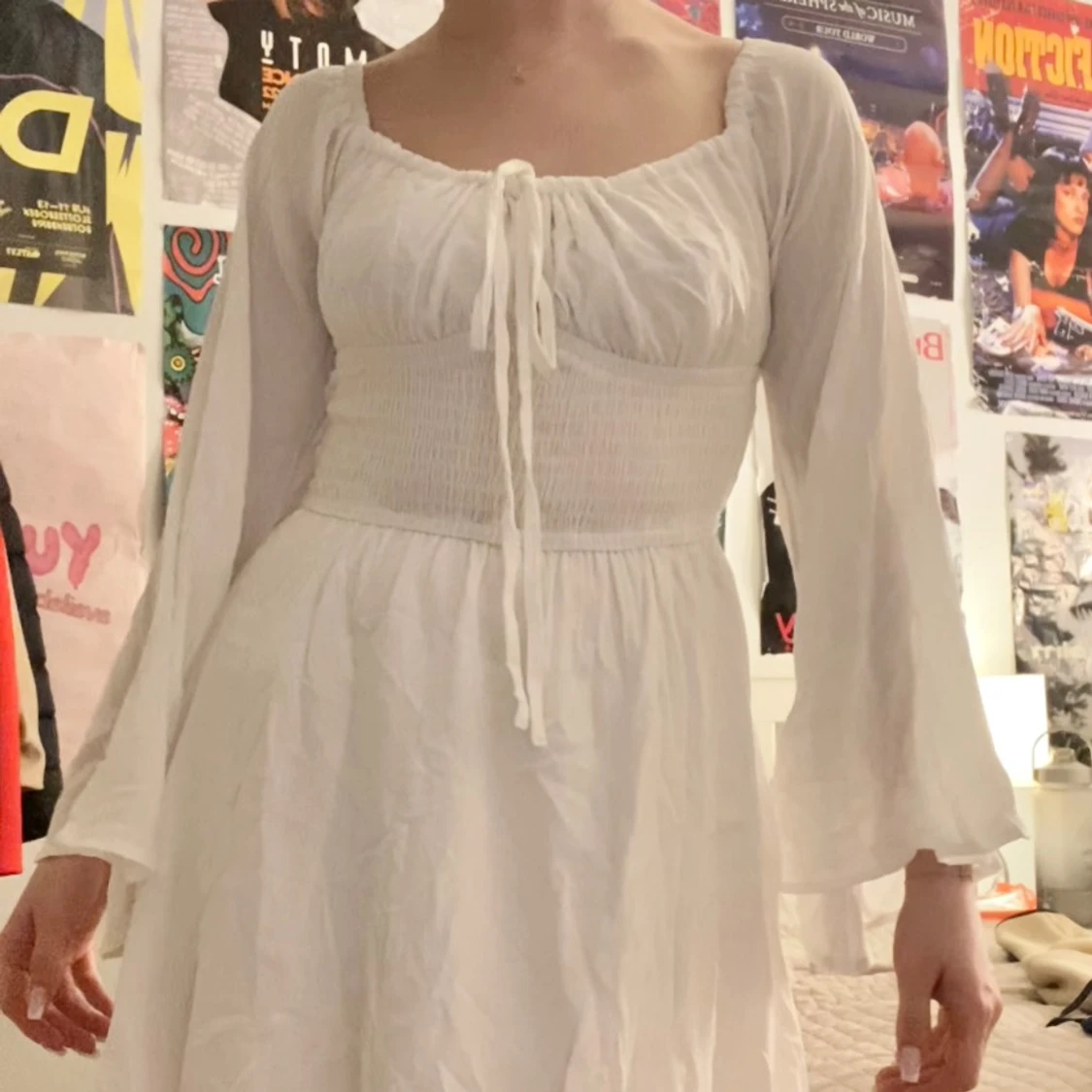 Jätte söt sommarklänning, tänkte använda som studentklänning men valde en annan. Aldrig använd och lappen är kvar. Är 156cm och brukar bära S. Skriv för fler bilder eller mått🥰