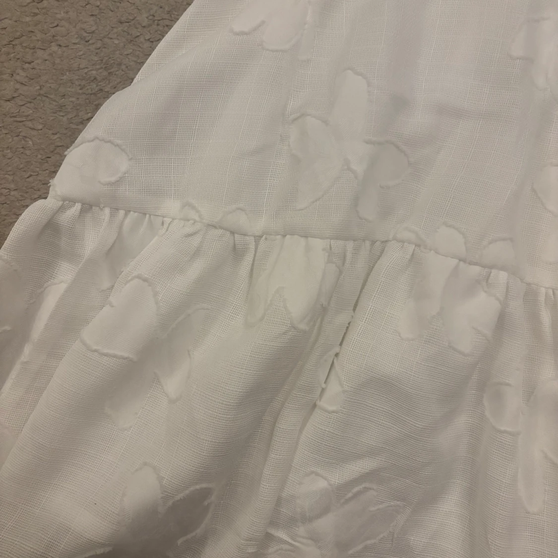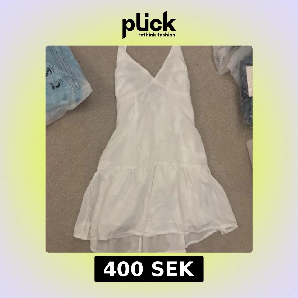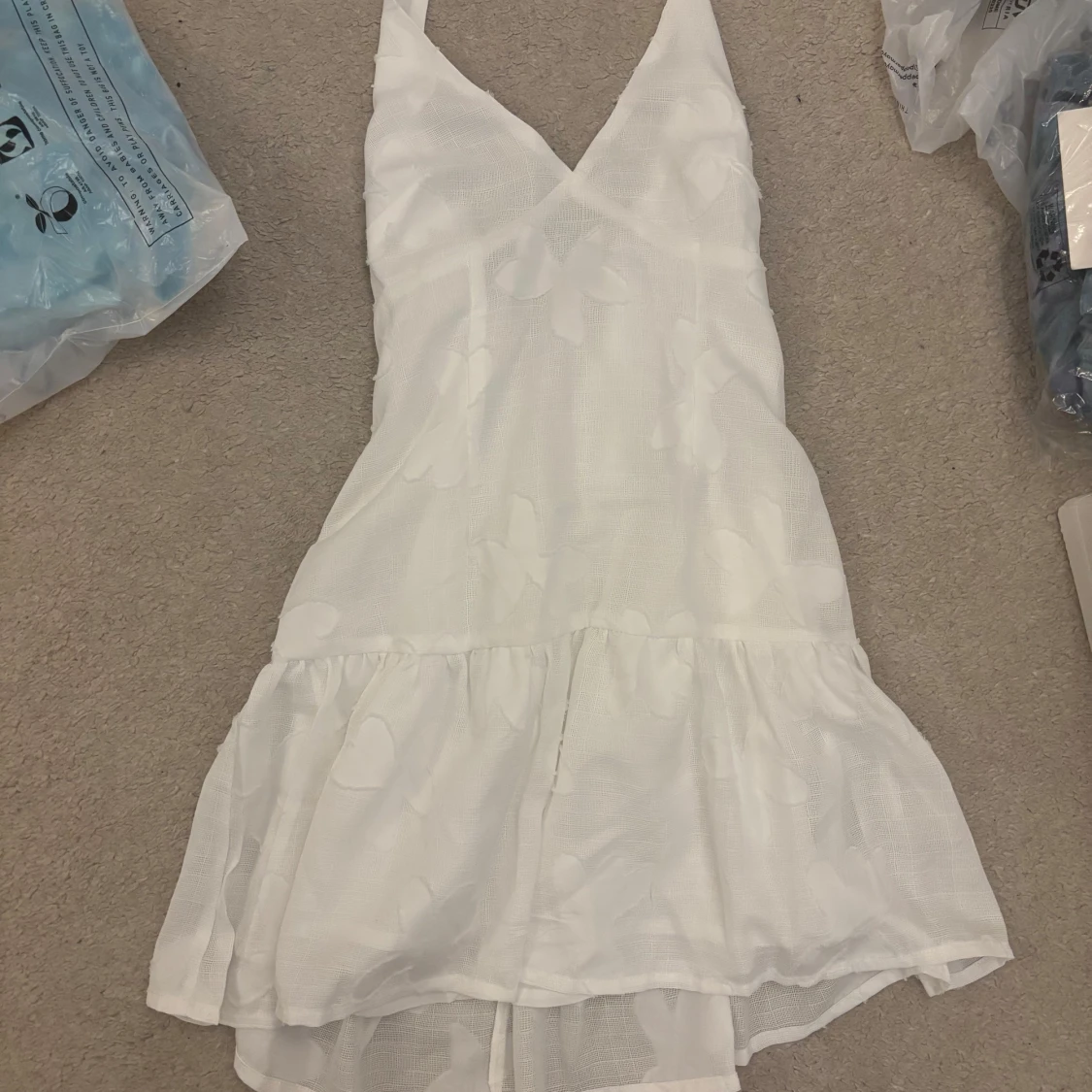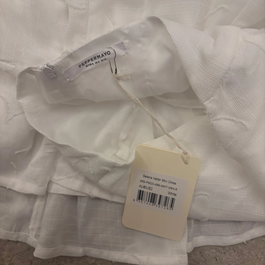 Superfin vit kortklänning från Peppermayo med v-ringning och volang nertill och halterneck. Superfin men var tyvärr för liten för mig. Storlek 34, AU 6, US 2. Endast provad, alla lappar kvar.