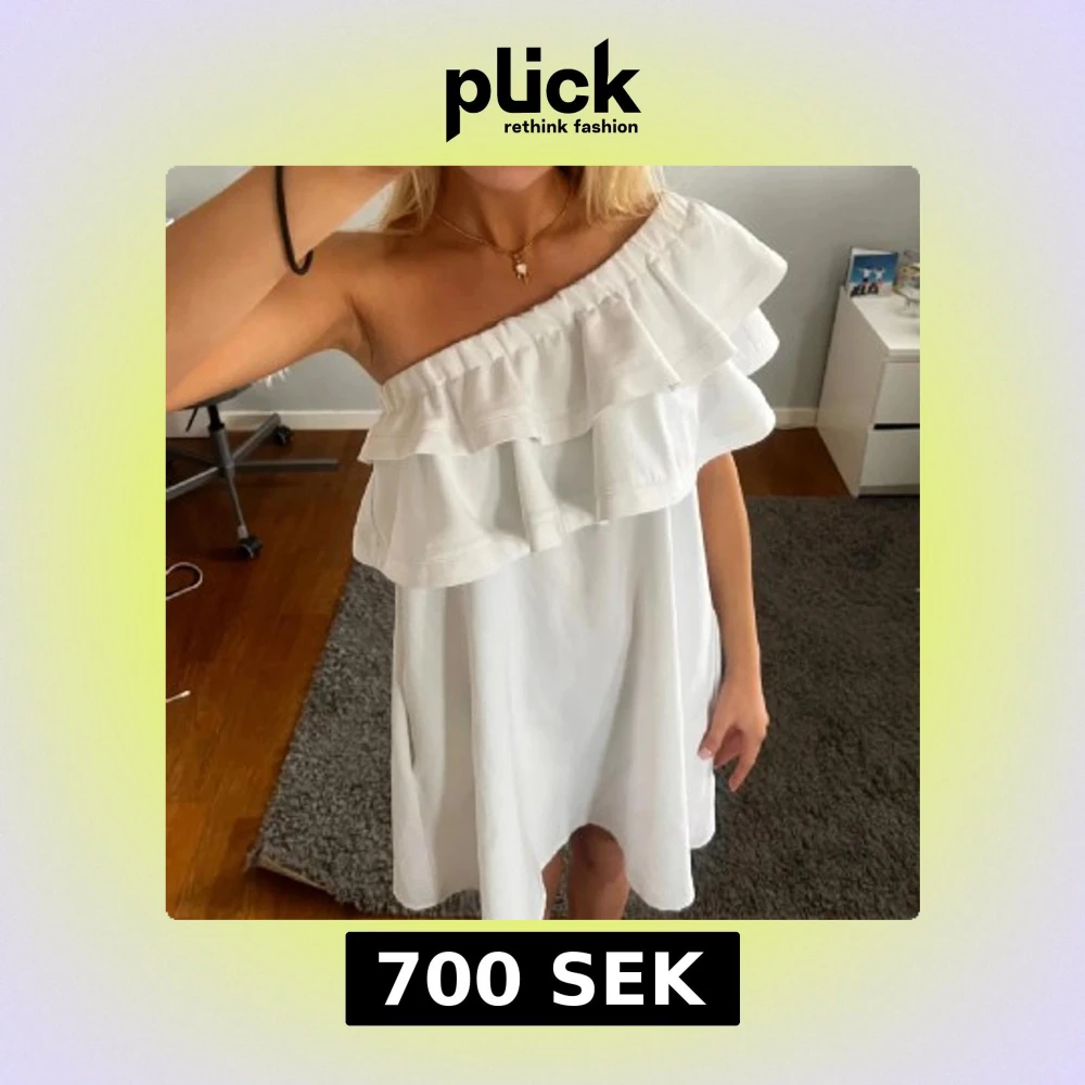 Otroligt fin one-shoulder klänning med stora volanger från COCOMORE boutique, perfekt till studenten eller sommaren!🤍 Storlek 36 men passar både större och mindre. Den har insydda fickor på sidorna (som nästan inte syns), jättebra kvalité och fint skick!! Går att bära på flera olika sätt🌟tryck gärna på ”köp nu”