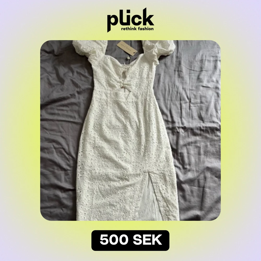 Jättefin vit klänning som passar perfekt för studenten eller midsommar🌸 Aldrig använd. Passar bra för någon med strl 34 och eventuellt 36, och en mindre byst. Ordinarie 1018kr men köpt på rea för 560kr.