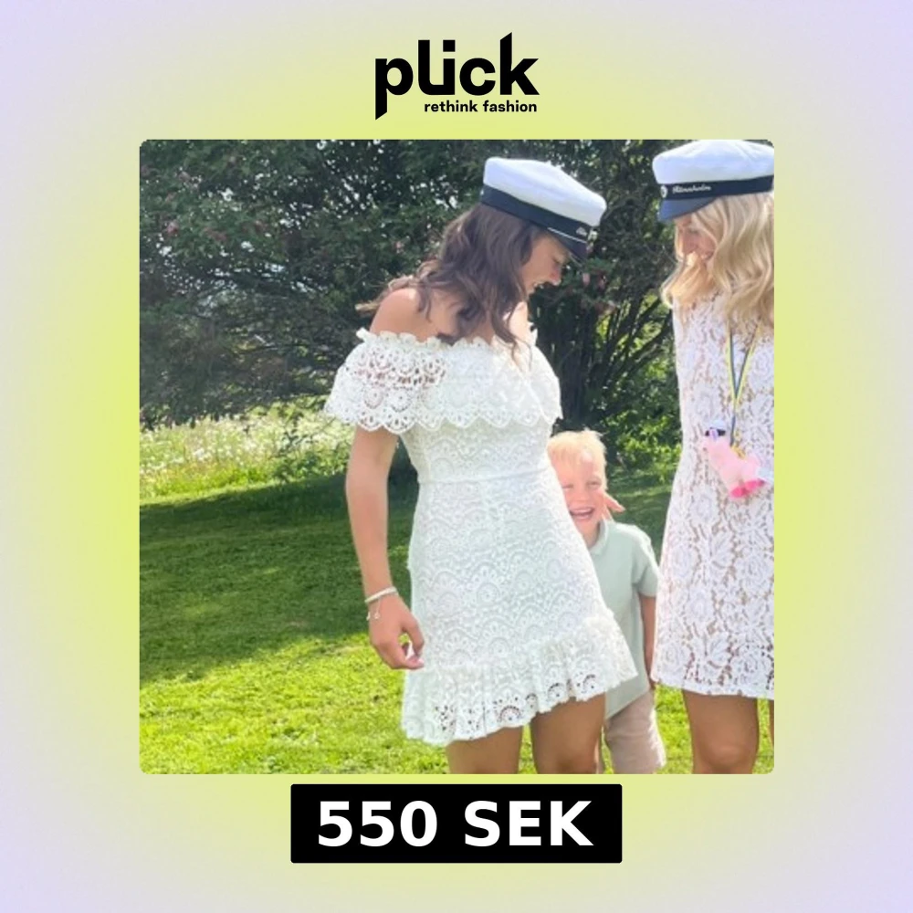 Charmig vit spetsklänning med offshoulder-design och volangdetaljer. Använd en gång på studenten och trivdes jättebra i den! Köptes för ca 900kr 💕💕