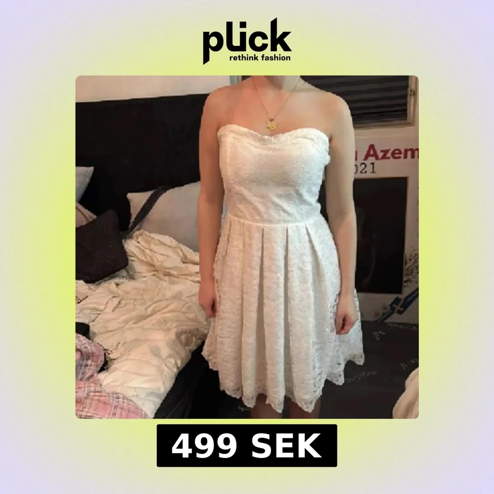Säljer en söt vit axelbandslös klänning med spetsdetaljer och lätt utställd kjol. Klänningen har dragkedja i ryggen och en romantisk känsla, perfekt för sommarens tillfällen. Passformen är normal och längden är kort. Passar finare på längre tjejer då den sitter kortare, jag är bara 1.58 lång😁