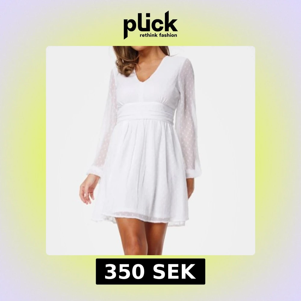 Superfin studentklänning med v-ringad hals, långa transparenta ärmar och markerad midja med knytband bak. Prickigt mönster i tyget och lätt volang i kjolen. Bara använd en gång! Nypris 599kr