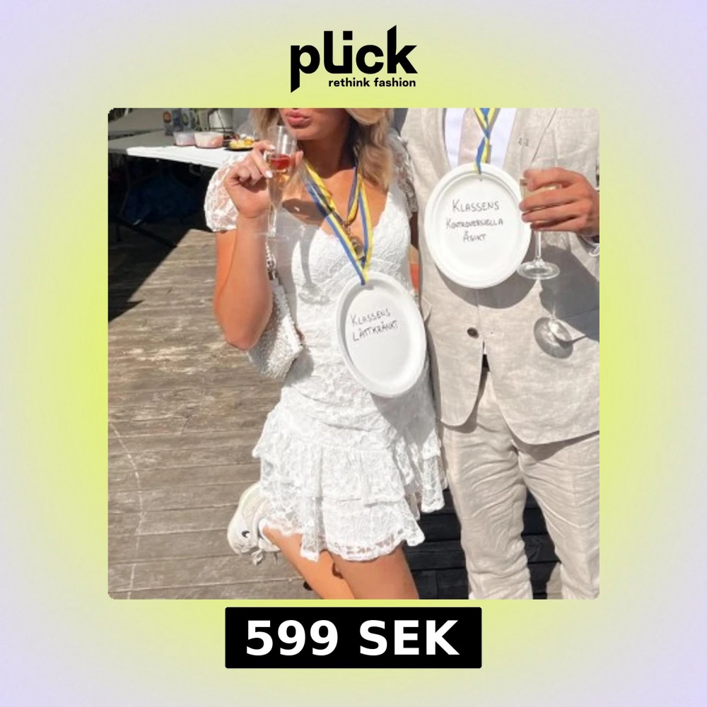 Söt vit spetsklänning med volanger och korta ärmar. Klänningen har en v-ringad design. Perfekt för studenten! Klänningen är beställd från Australien och endast använd vid ett tillfälle