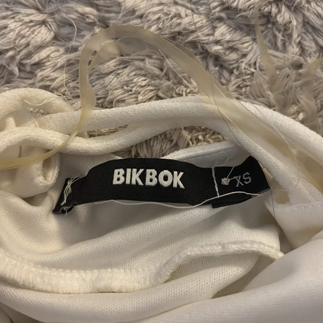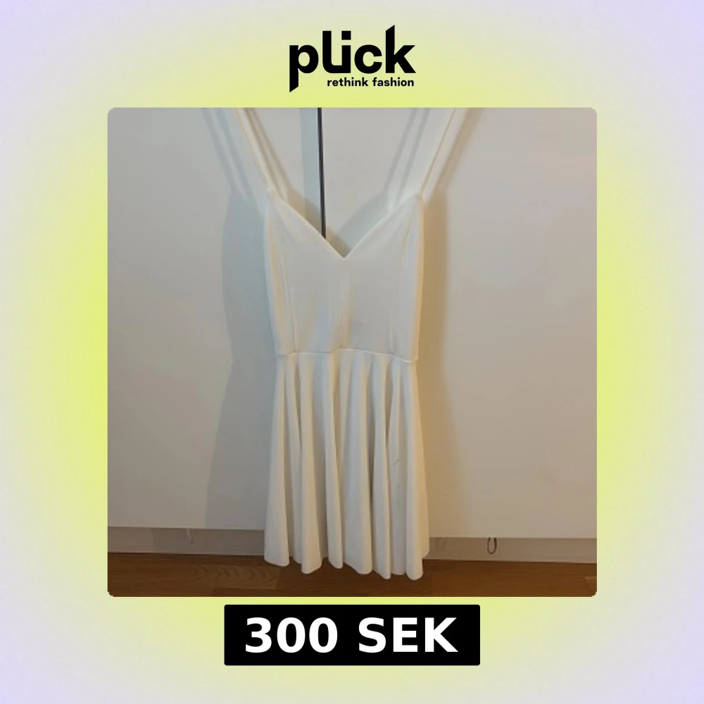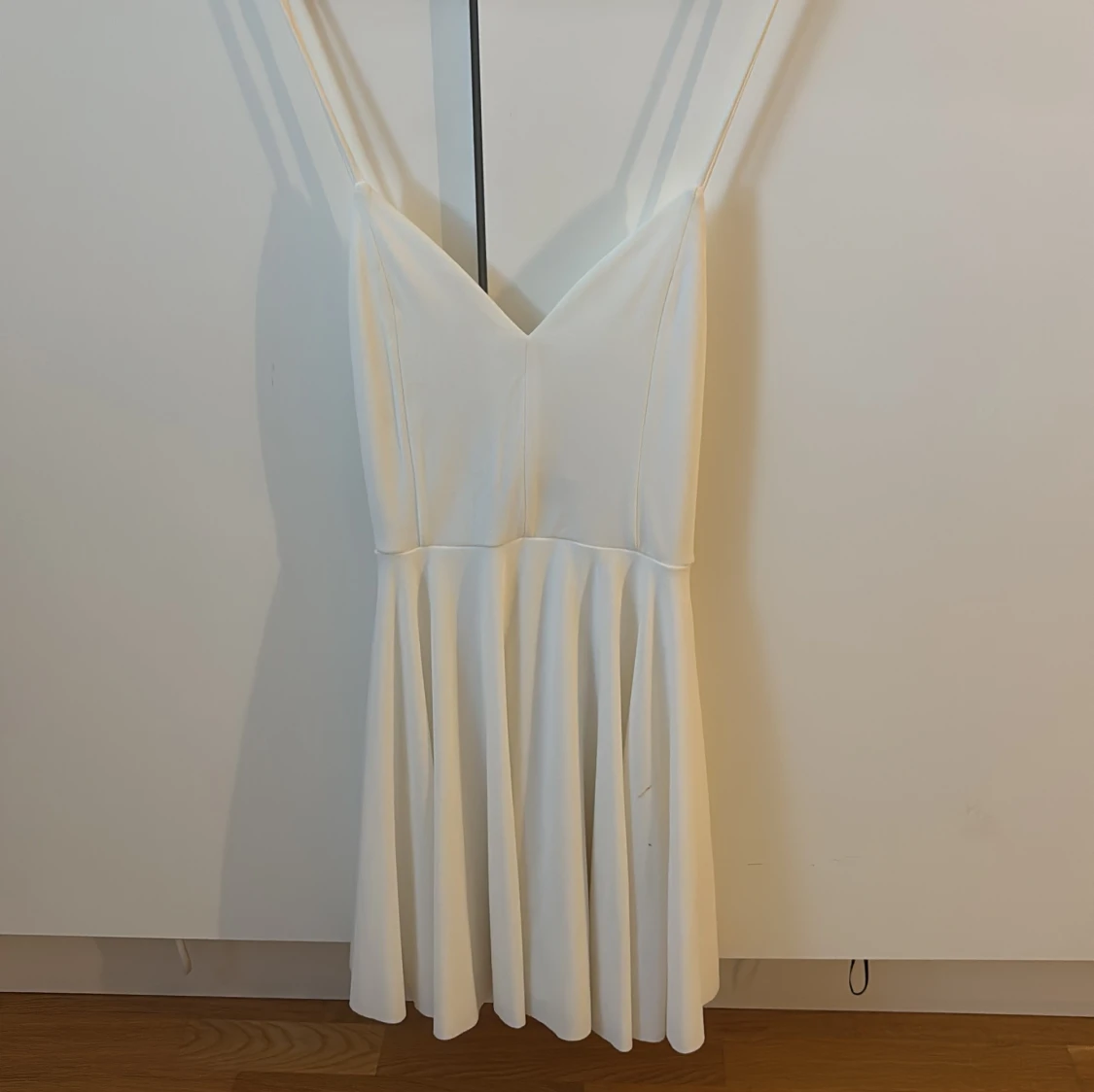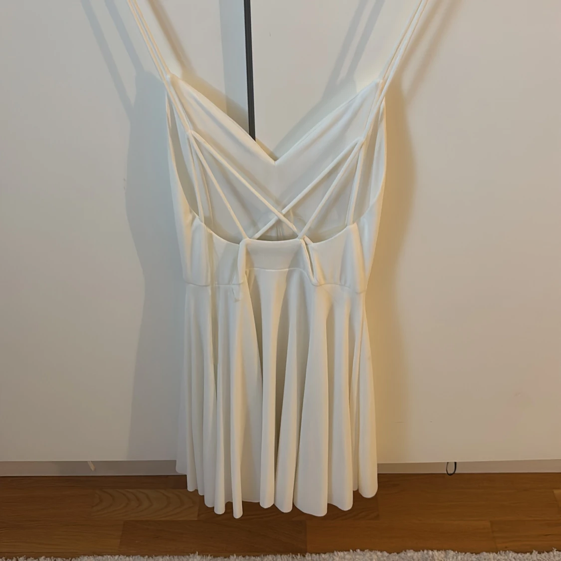 Supersöt vit kort klänning från BikBok i storlek XS, passar även S. Används även som studentklänning! Klänningen har smala axelband, v-ringning och ett flowy kjolparti. Den sitter otroligt fint på midjan. Baksidan har snygga korsade band som ger en extra detalj. Perfekt för sommarens alla tillfällen eller studenten! Använd 1 gång.