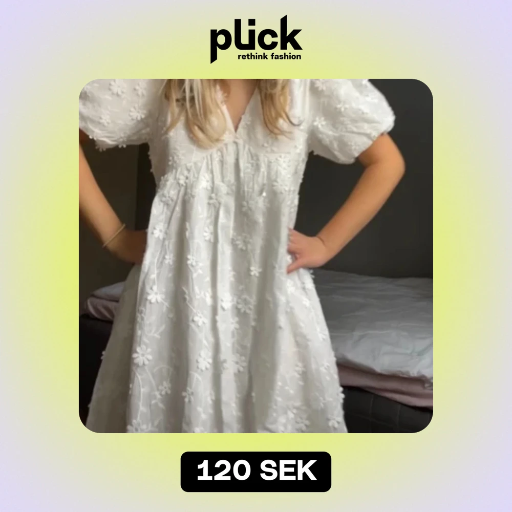 Helt oanvänd (prislappen kvar)! Så fin vit klänning med blommor köpt på danska hemsidan Bystenholt för ca 350 kr på rea, finns ej att köpa där längre dock. Storlek S men rätt pösig i modellen så passar nog även M!
