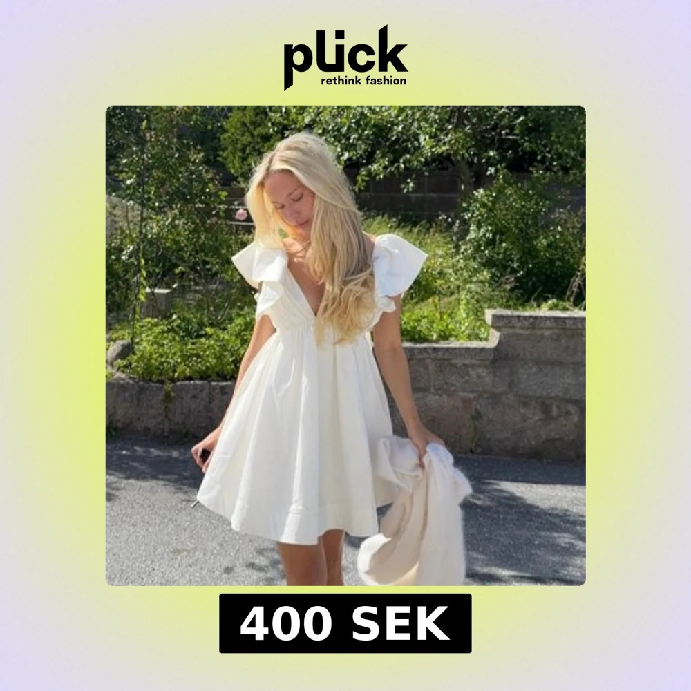 Supersöt vit kort klänning med djup v-ringning och breda volangärmar. Klänningen har en luftig passform och är tillverkad i ett lätt bomullsmaterial som ger en fräsch och somrig känsla. Perfekt för studenten, den är slutsåld överallt, säljer då jag hittade en studentklänning jag gillade bättre men annars hade jag valt denna hundra procent. BILDERNA ÄR LÅNADE!