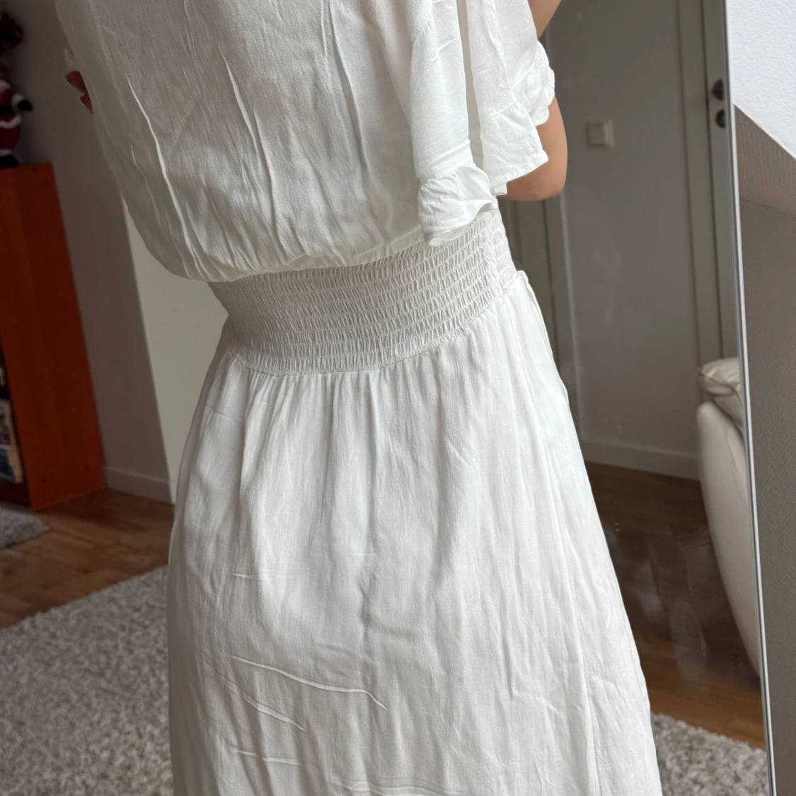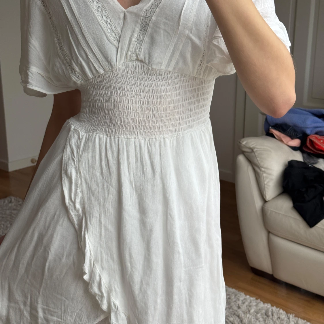Säljer en vacker vit klänning med smockdetalj i midjan och v-ringad hals. Klänningen har korta ärmar och ett luftigt fall, perfekt för varma dagar. Den har en omlott-look framtill som ger en extra touch. Perfekt för sommarens alla tillfällen såsom studenten!