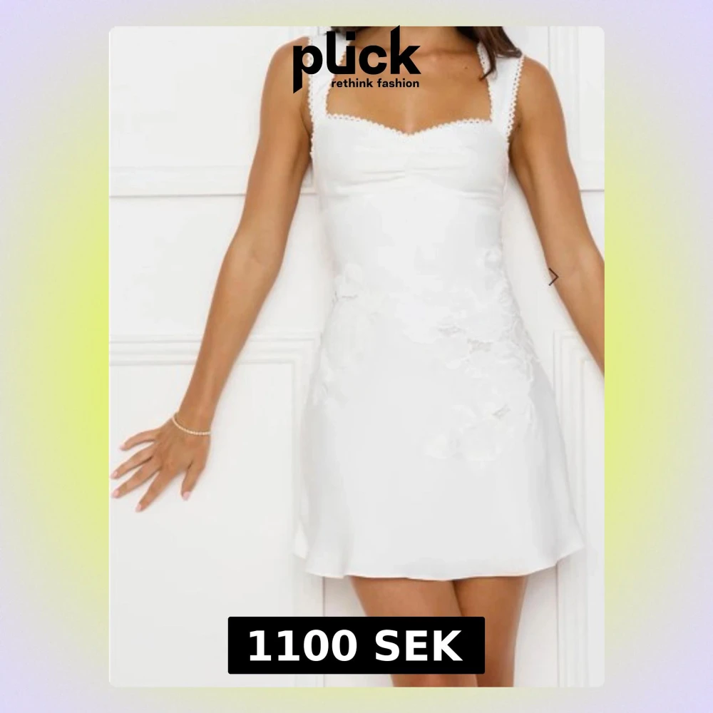 Helt ny med lappen kvar, har endast provat den en gång. Pris kan diskuteras. Supersöt vit kort klänning med smala axelband och spetsdetaljer längs kanterna. Klänningen har en figurnära passform och subtila blommiga broderier på sidan. Perfekt för sommarens alla tillfällen!