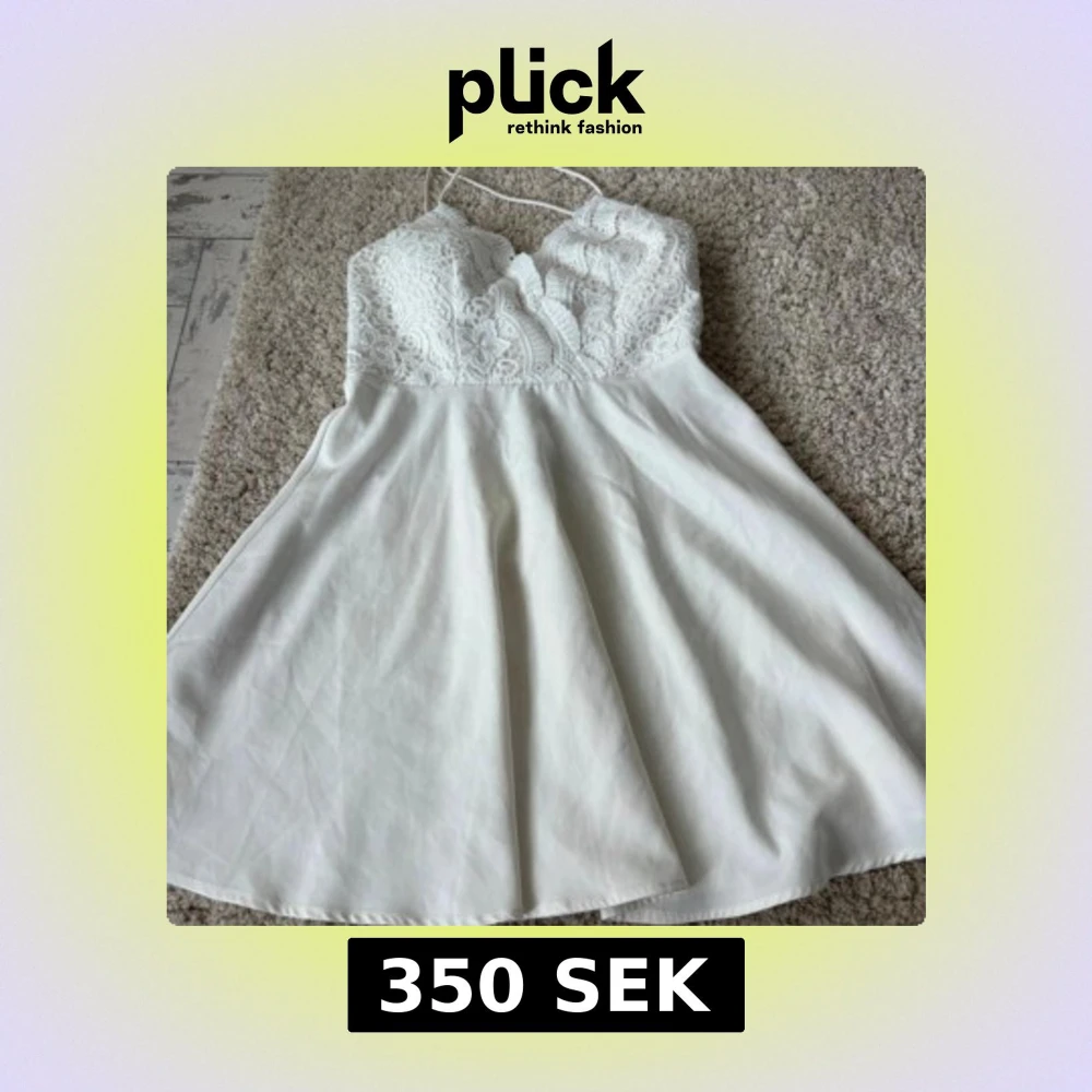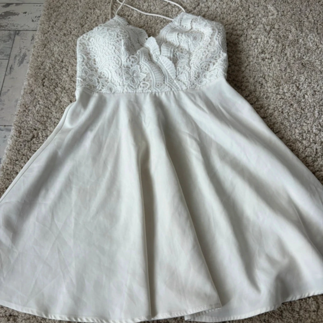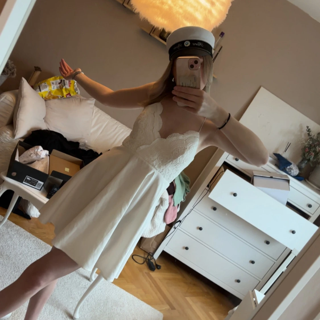 Supersöt vit kortklänning med spets upptill och smala axelband. Klänningen har en v-ringad omlottkänsla och en flowy kjol i lätt material. Spetsen ger en romantisk vibe och den är perfekt för student eller sommarens alla tillfällen.