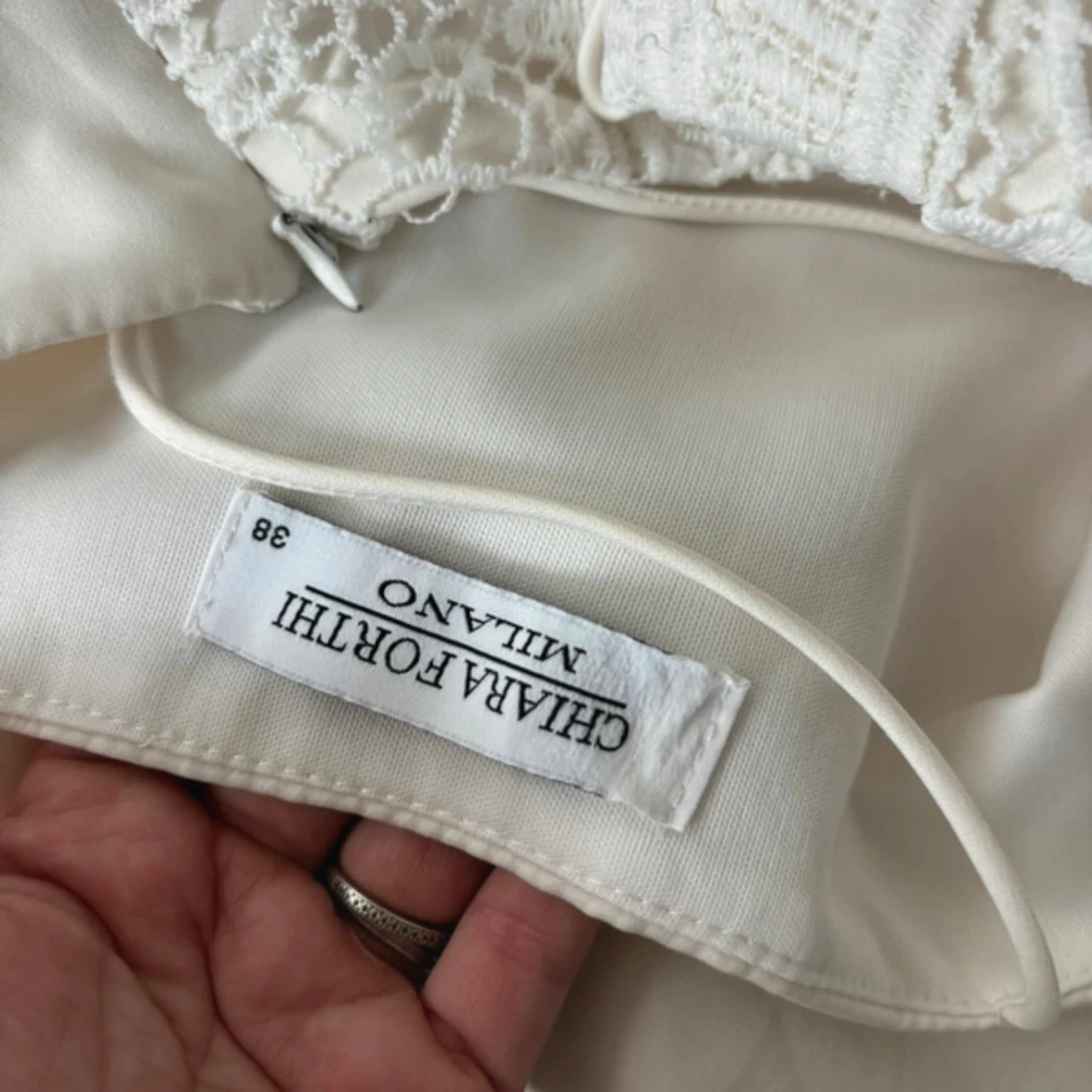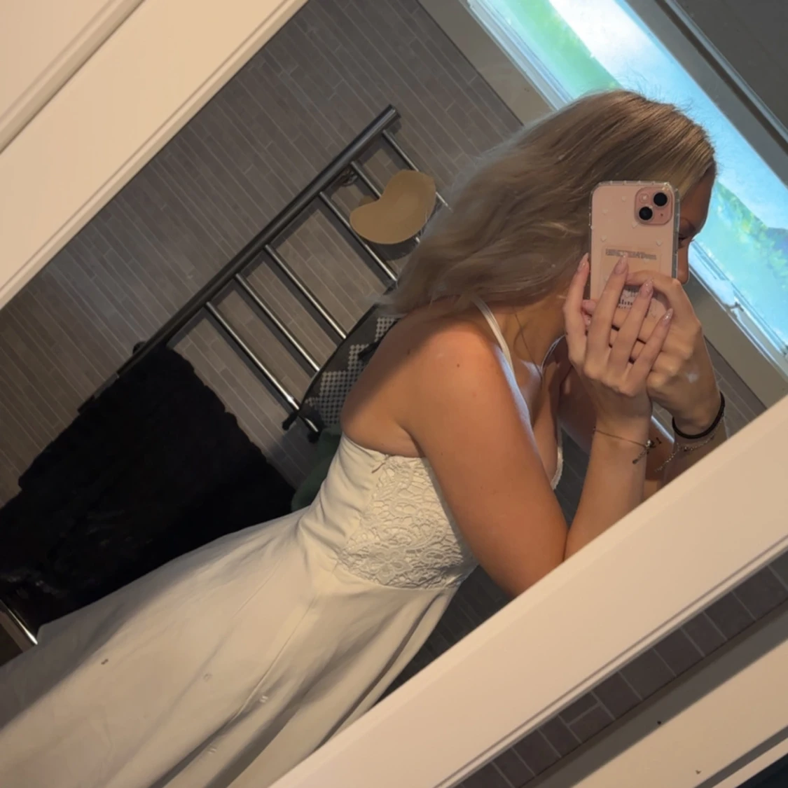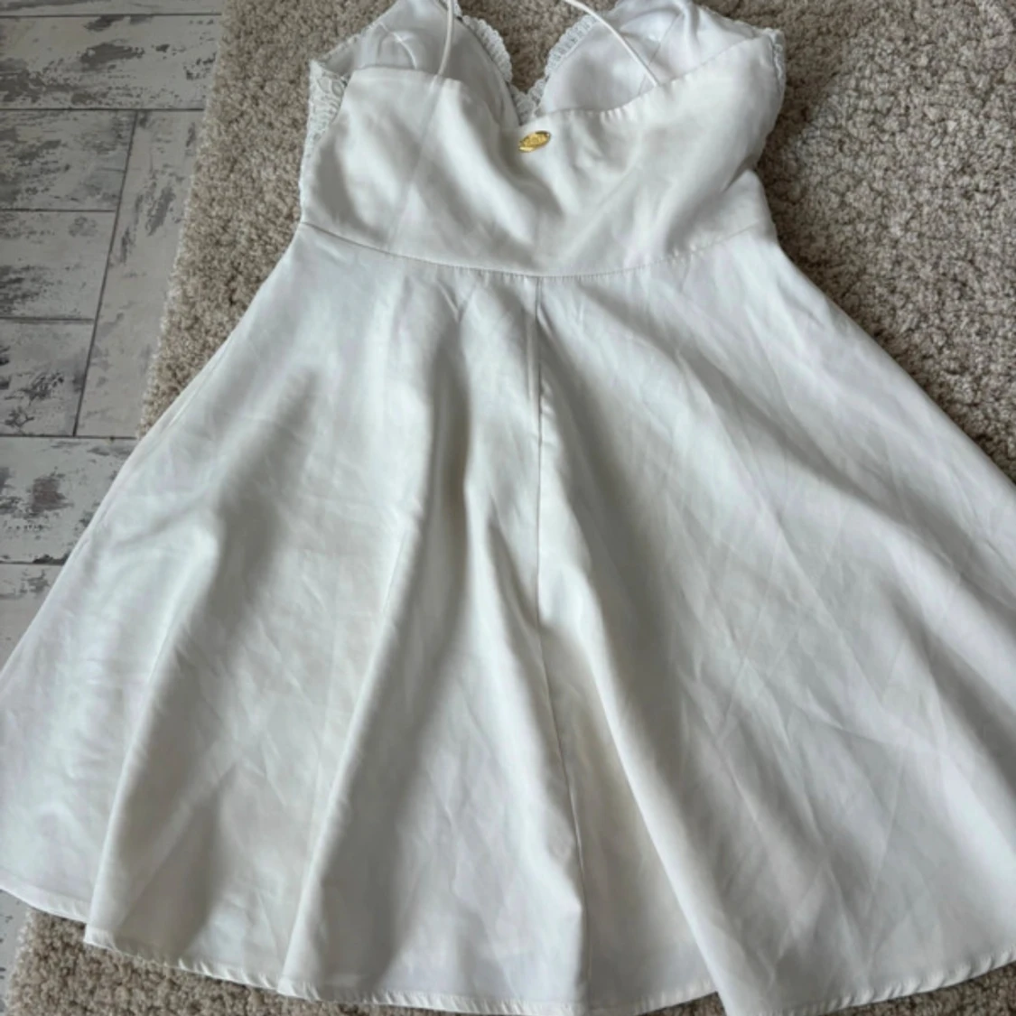 Supersöt vit kortklänning med spets upptill och smala axelband. Klänningen har en v-ringad omlottkänsla och en flowy kjol i lätt material. Spetsen ger en romantisk vibe och den är perfekt för student eller sommarens alla tillfällen.