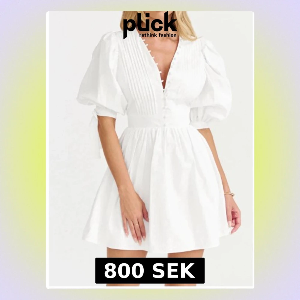 Supersöt vit kort klänning med puffärmar, v-ringning och knappar framtill. Klänningen har markerad midja, veckade detaljer på bröstet och knytband vid ärmsluten. Perfekt som studentklänning! Den är helt ny med lapparna på, tyvärr passade den inte mig. Aldrig använd, nypris 995kr efter tull och frakt.