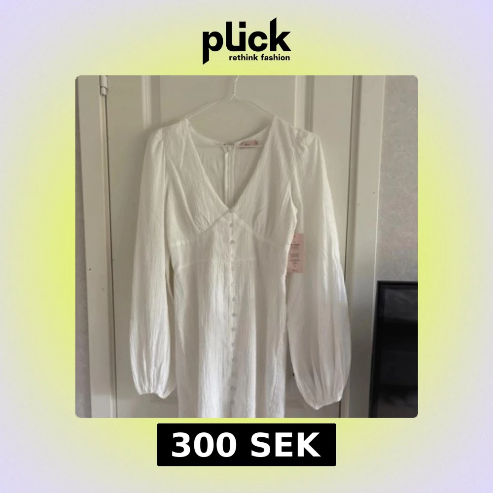 Säljer en elegant vit klänning med långa ärmar och v-ringning. Klänningen har knappar framtill och är tillverkad i ett lätt, strukturerat material. Den har en dragkedja på baksidan! Perfekt för sommarens tillfällen eller studentfirande.
