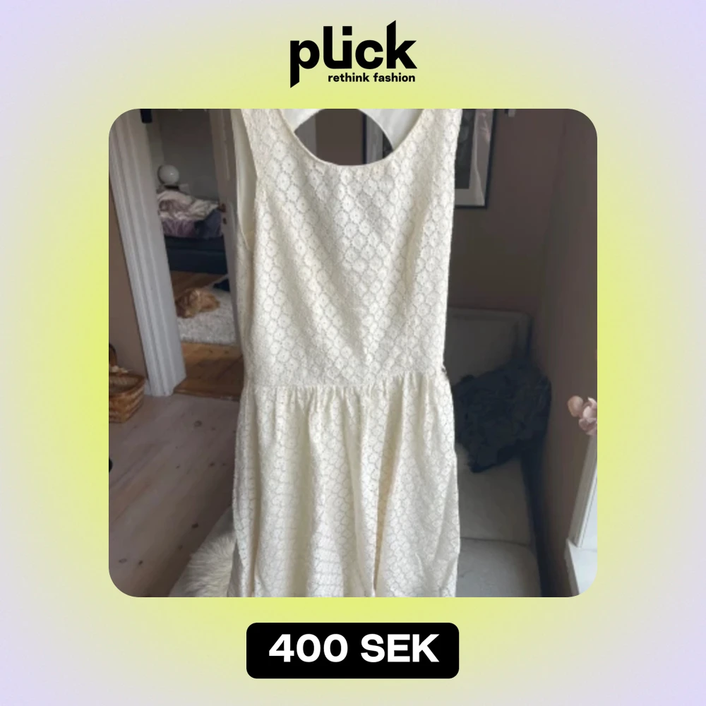 En fin avslutningsklänning i en krämvit färg och med öppen rygg. Den har en dragkedja på sidan så den är enkel att få på 🫶🏼 finns ingen lapp men vad jag kan minnas är det en S. Den ligger iaf någonstans mellan xs/a 🥰