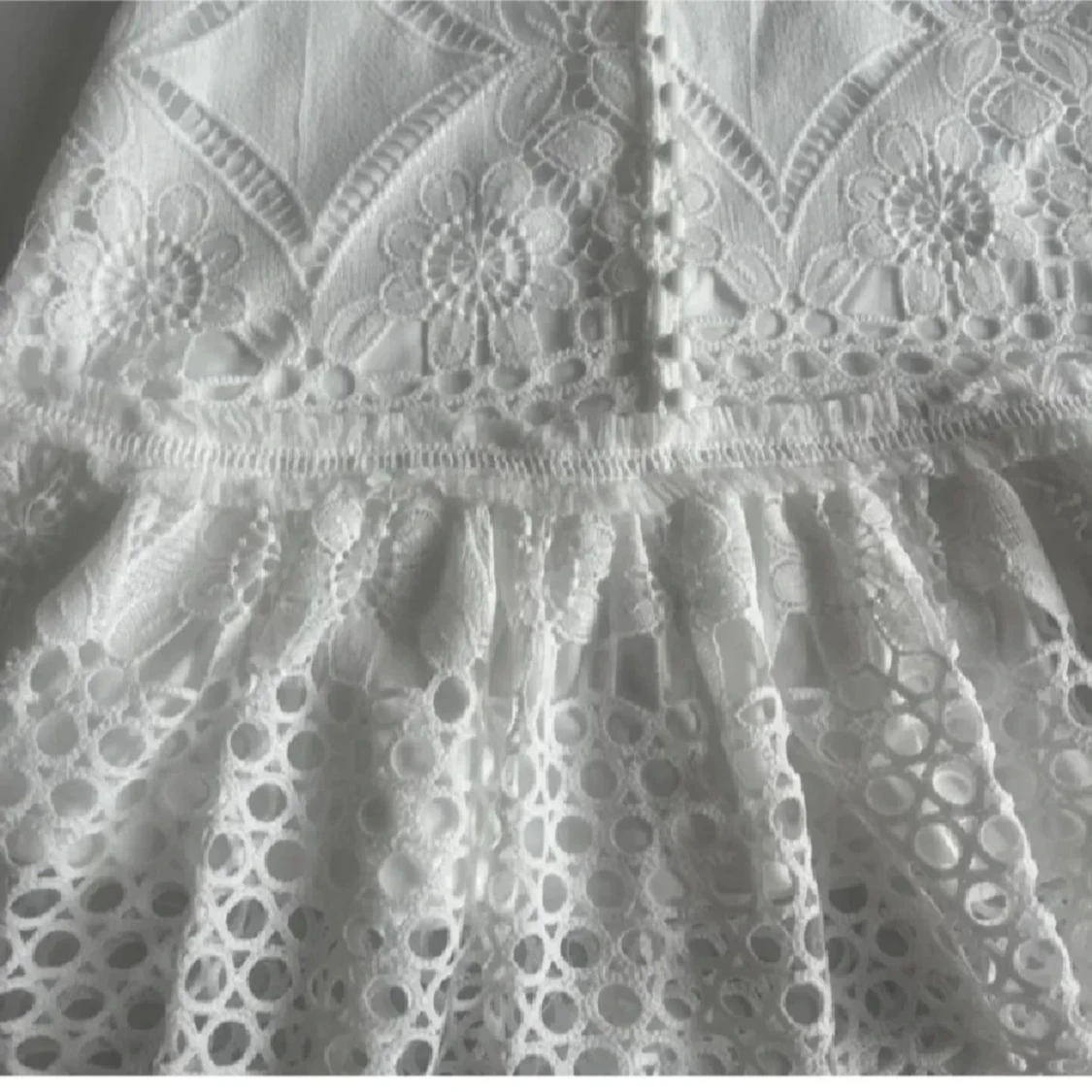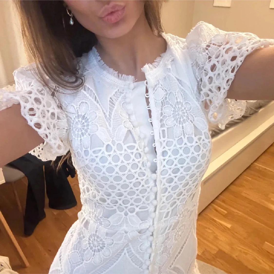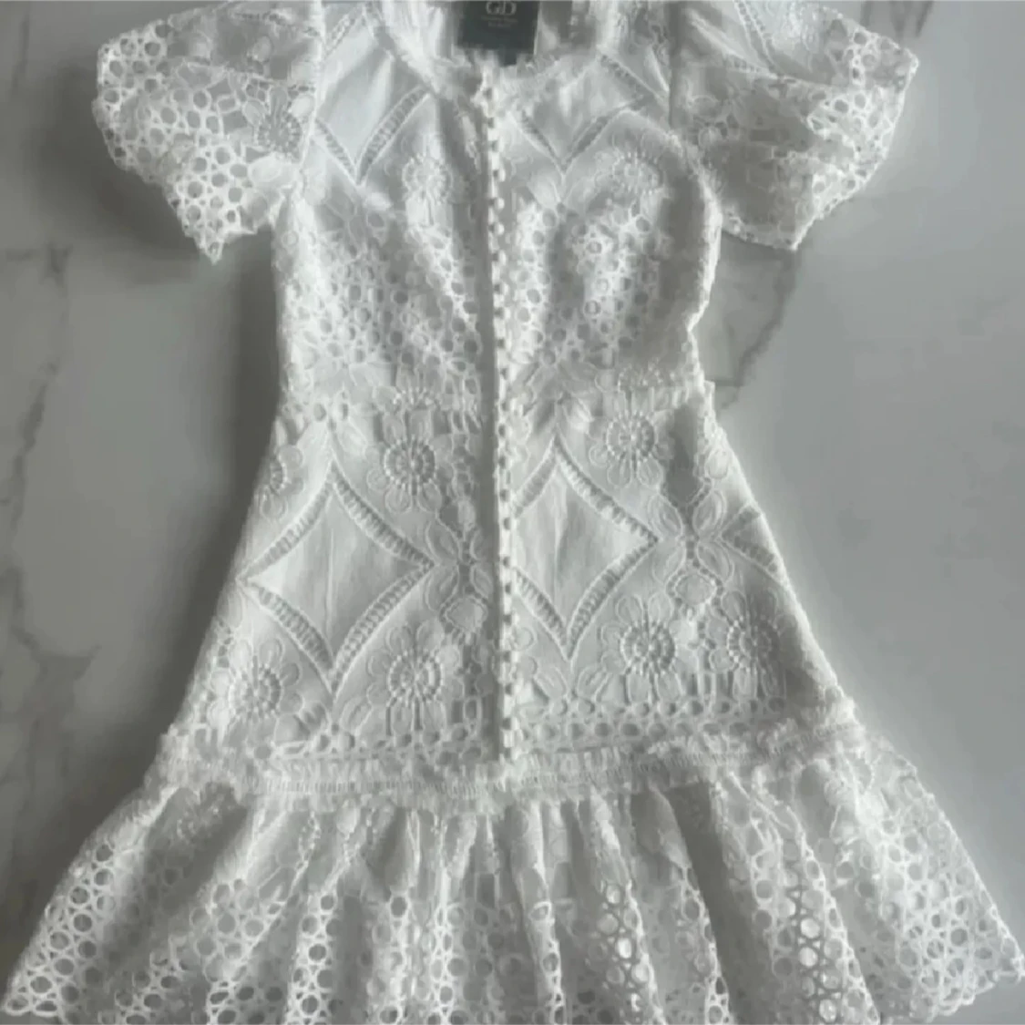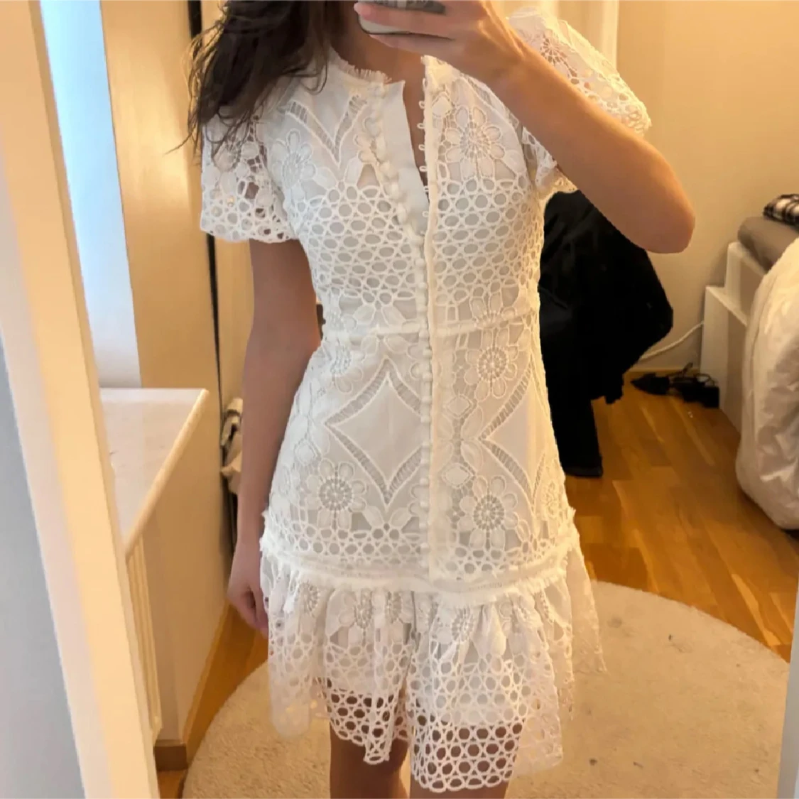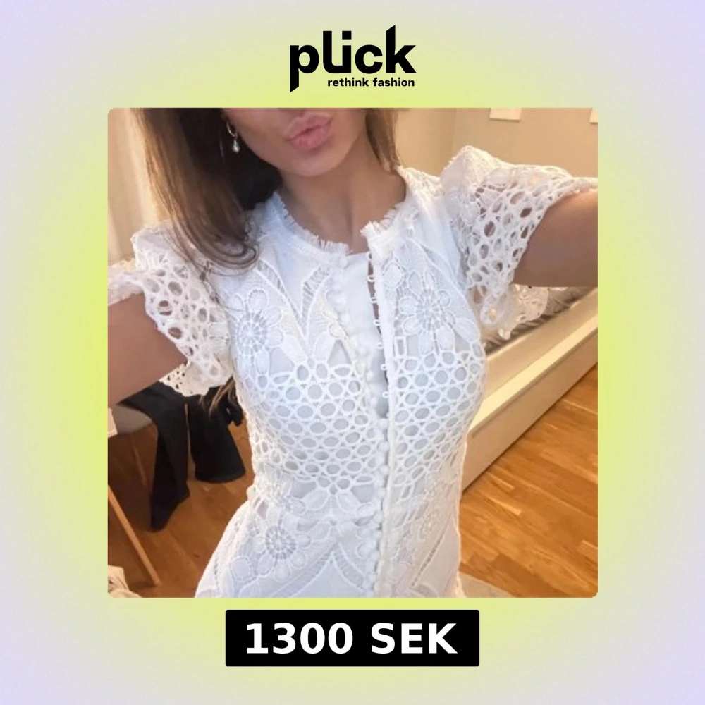 Superfin vit kortklänning med broderade blommor, spetsdetaljer och volang nertill. Klänningen har korta ärmar, knappar framtill och v-ringad hals. Perfekt inför studenten! Prislappen är kvar☺️ Går inte att få tag i här i Sverige🙏🏼
