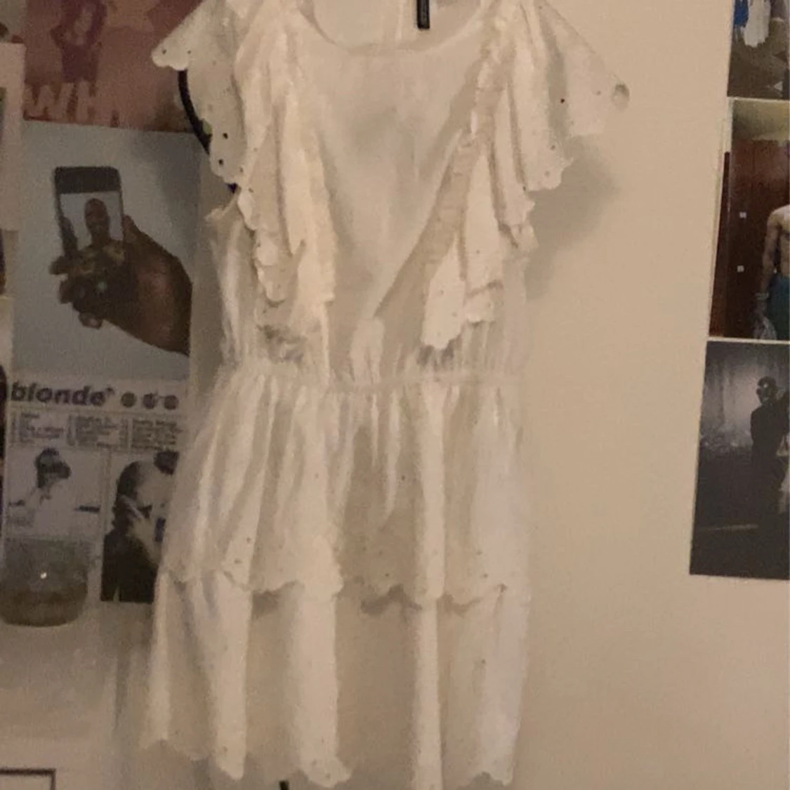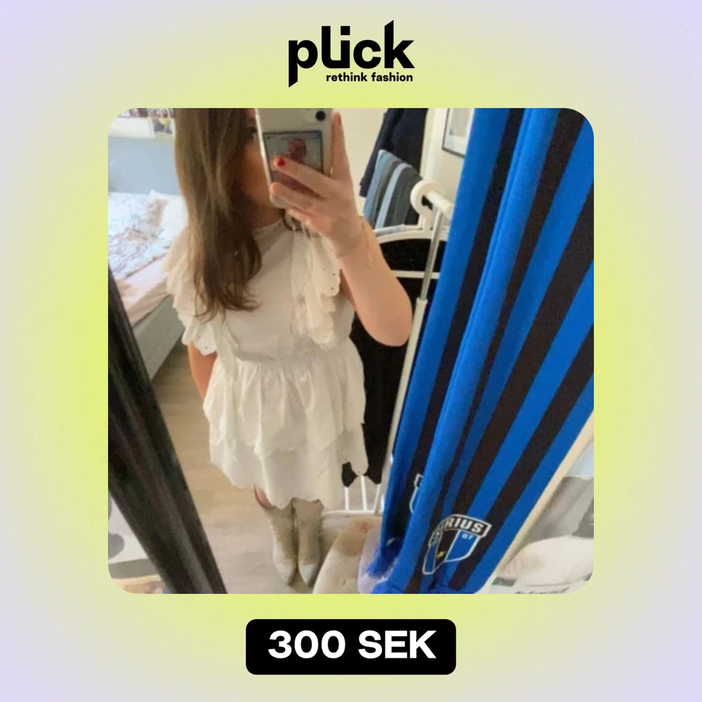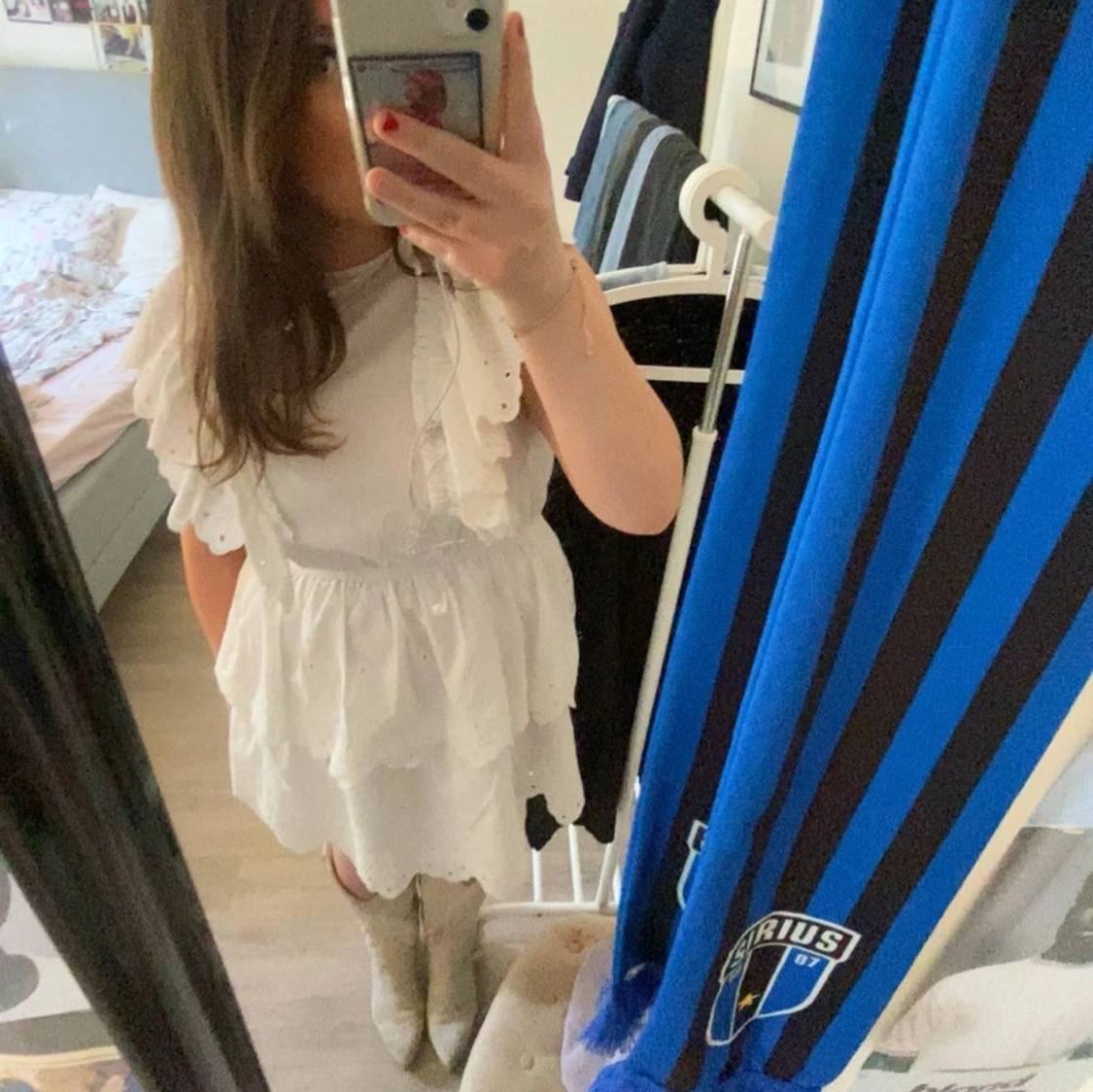 En vit volangklänning med volang både på över och underdel. Volangerna har brodyr på sig. Klänningen är från hm och har pristlappen kvar💕