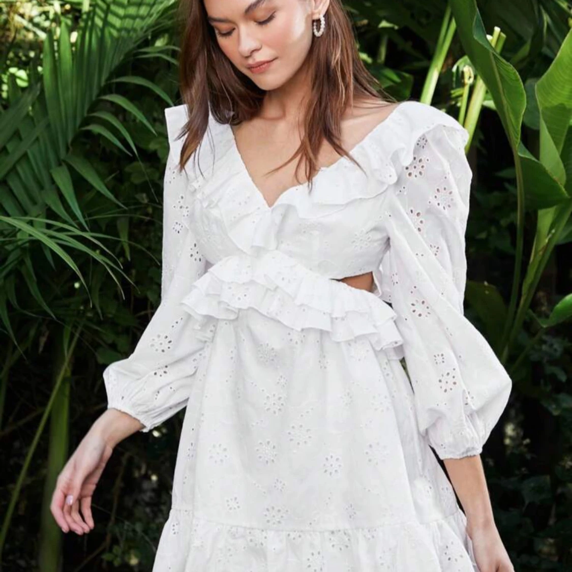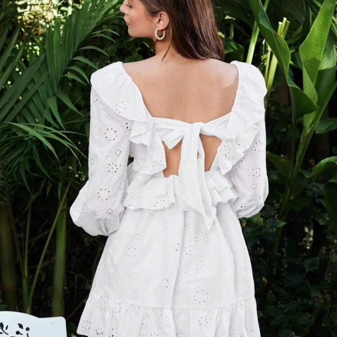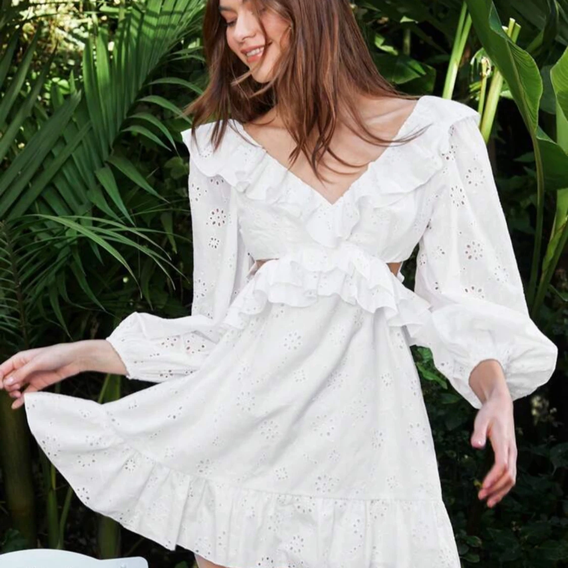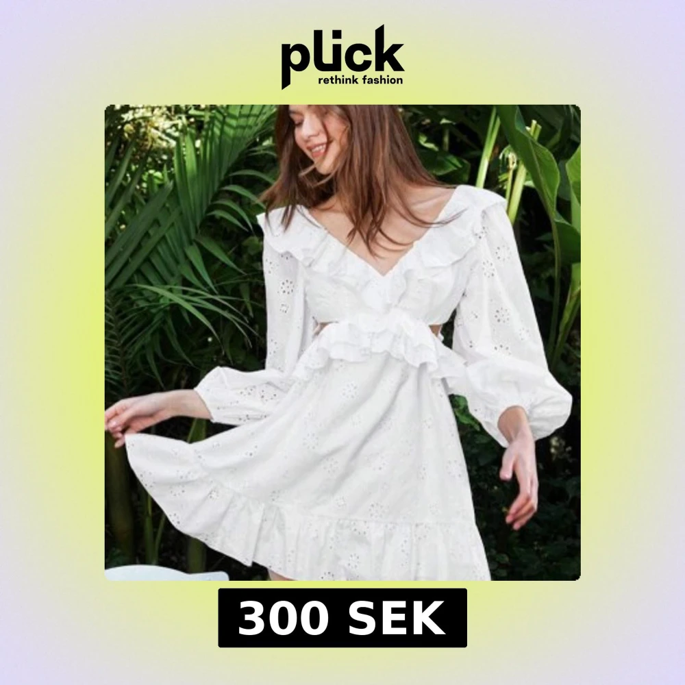 Studentklänning med volanger och spetsdetaljer. Klänningen har en v-ringad design med långa ärmar och en öppen rygg med knytning. Perfekt för sommaren och studenten.