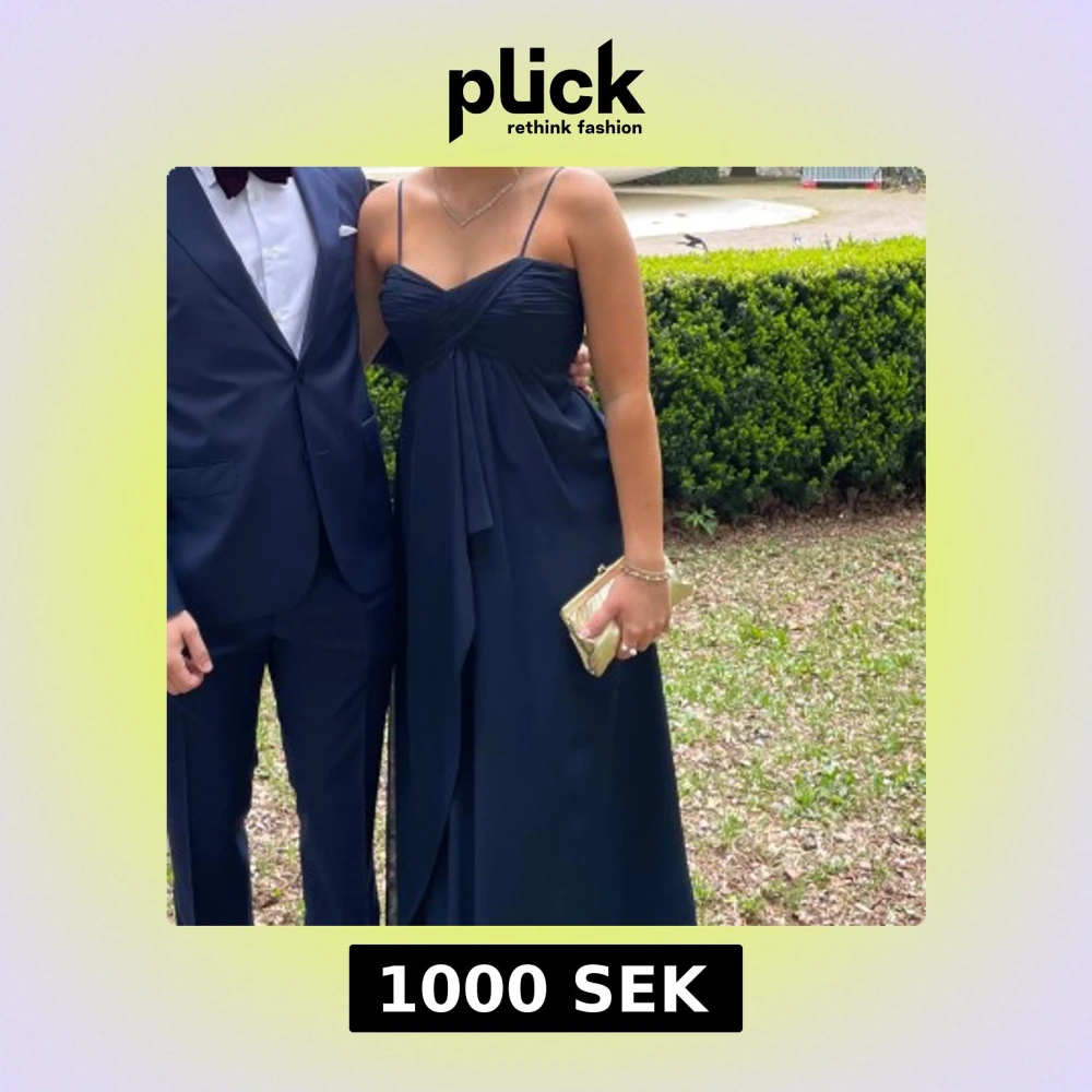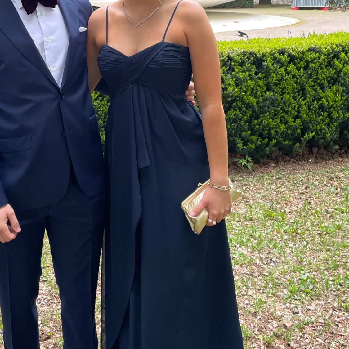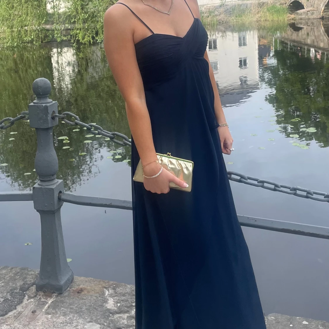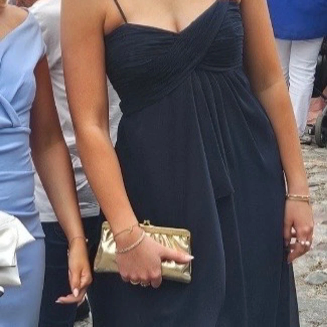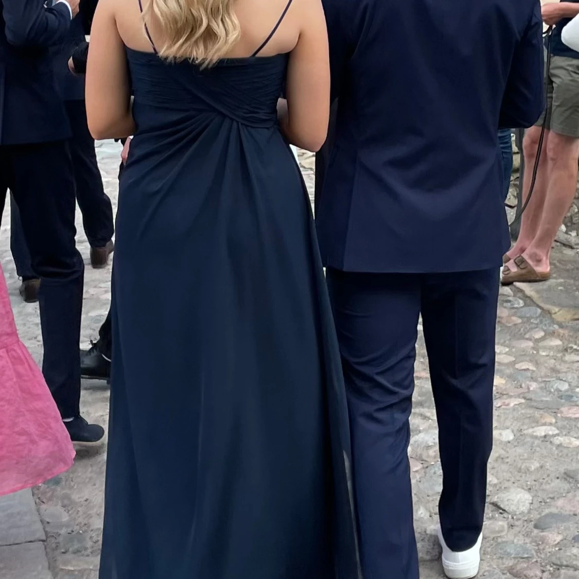 Superfin marinblå långklänning med smala axelband och omlott-design. Använd en gång. Storleken visar UK 12 vilket motsvarar EU 40 men skulle säga att den sitter som en S/M/36/38💙ni kan även skriva prisförslag vid intresse