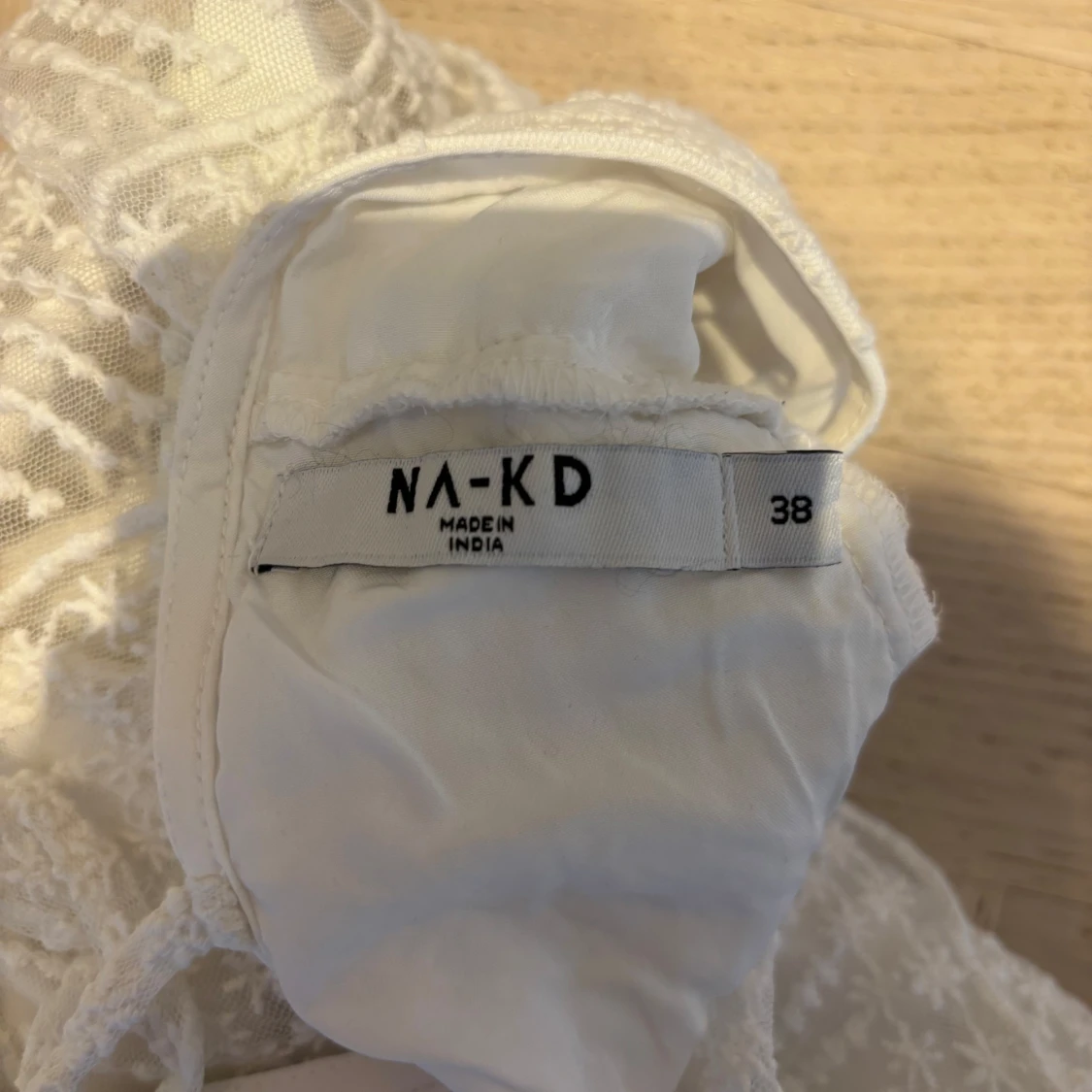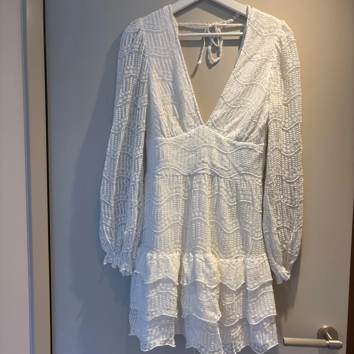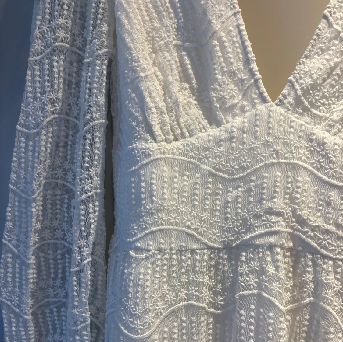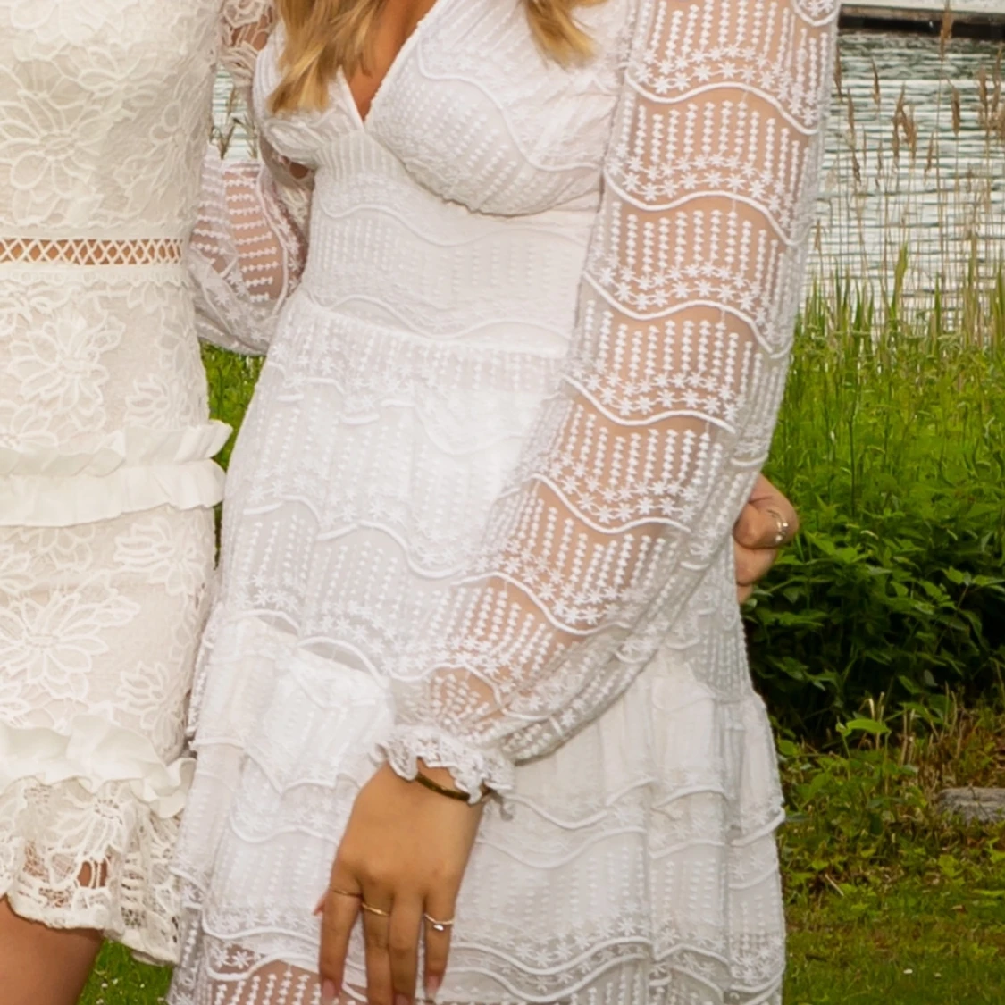 Superfin vit student klänning från NA-KD med v-ringning och långa ärmar. Klänningen har spetsdetaljer, volanger och ett romantiskt mönster. Perfekt för sommarens tillfällen och studentfirande.