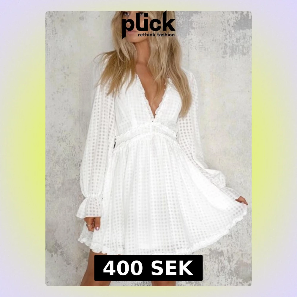 Superfin vit kortklänning från Dennis Maglic med långärmade puffärmar, volangdetaljer och öppen rygg. Klänningen har ett diskret rutigt mönster i tyget och knappar i nacken. Jätte gullig och passar som perfekt som studentklänning !! Storlek L och helt ny med prislappen på. Nypris 899 kr Första 2 bilderna är framsidan, 3-5 är baksidan och sista bilden är bevis på att den ej är använd. Länken till klänningen är https://dennismaglic.com/sv/products/veronica-dress , så man kan se bättre bilder