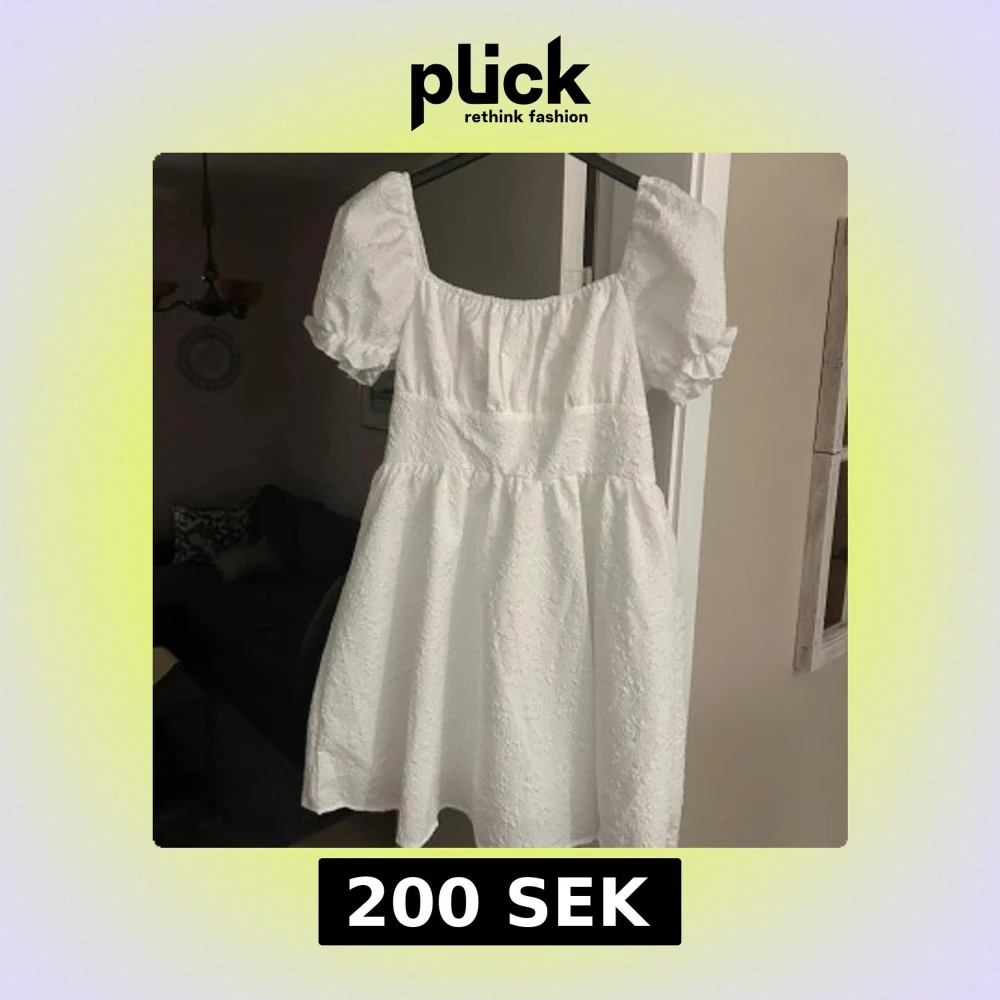 Charmig vit klänning med puffiga kortärmar och ett subtilt blommönster. Perfekt för studenten eller för sommaren .