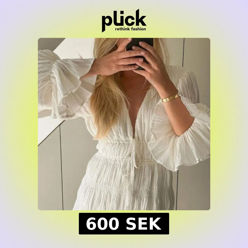 Säljer en supersöt vit klänning med djup v-ringning, långa volangärmar och knyt i midjan. Perfekt som studentklänning! 🥰(oanvänd, endast testad) Nypris 699kr Slutsåld på NA-KD!