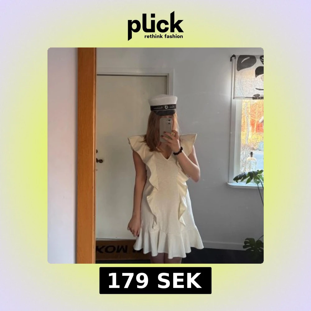 Säljer en söt vit klänning från H&M med volangdetaljer och öppen rygg. Perfekt för studenten och sommarens festligheter! 🌸