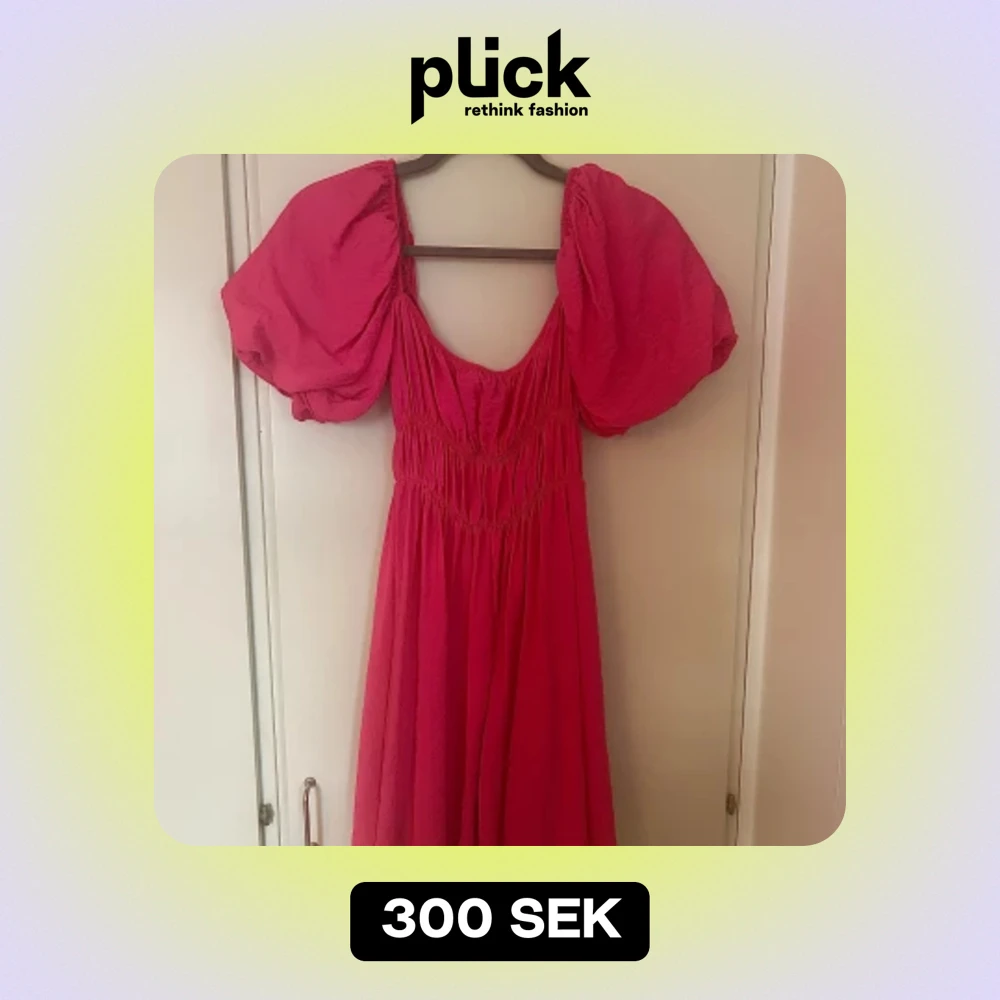 En rosa sommarklänning med stora ballongärmar. Är lagom i storleken och har används endast en gång så är i väldigt bra skick. Klänningen går lite över knäna.