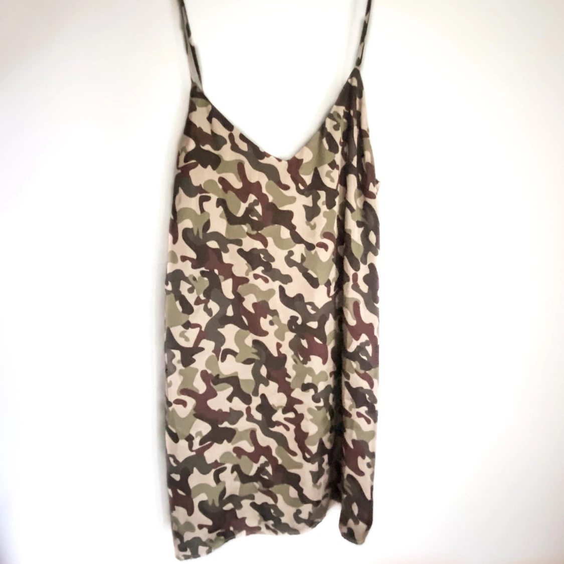 Military print dress in a silky feeling material, black underdress, good quality, Short/mid length, adjustable straps