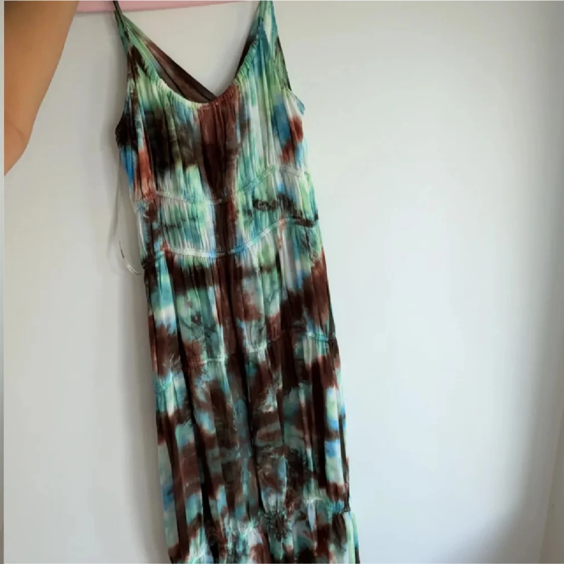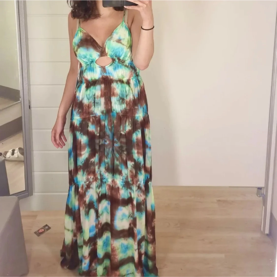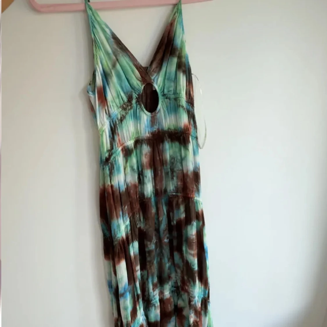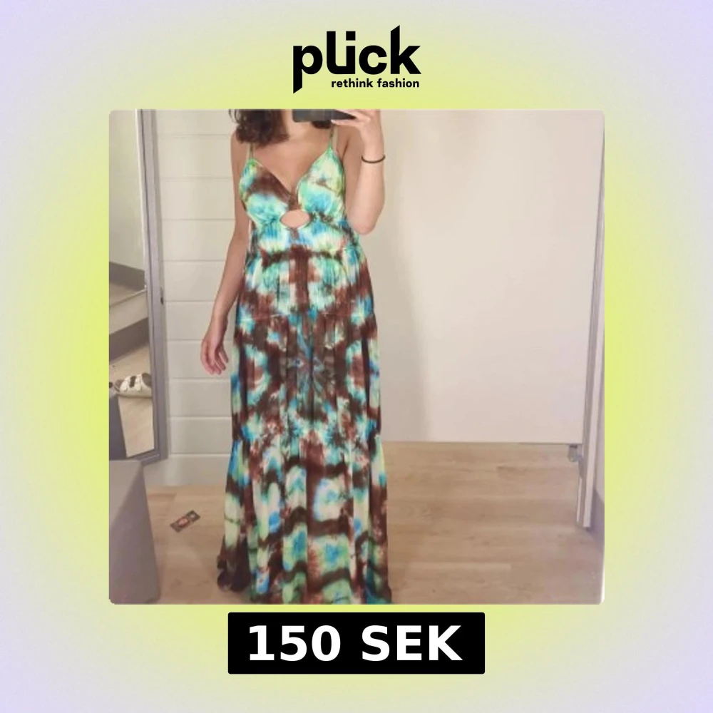Säljer en maxiklänning med batikmönster i blått, brunt och grönt. Klänningen har smala axelband, djup v-ringning och en snygg cut-out detalj framtill. Perfekt för sommardagar och festivaler. Materialet känns lätt och flowy.