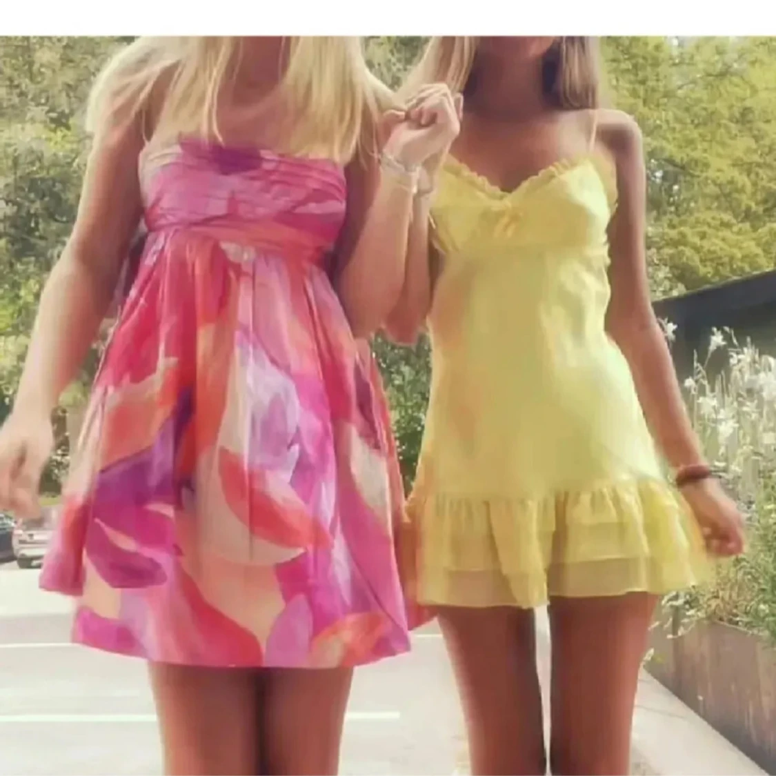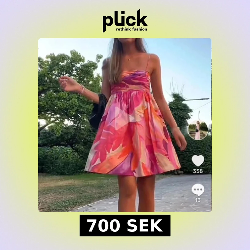 Säljer en superfin kortklänning med färgstarkt mönster i rosa, orange och vitt. Klänningen har smala axelband och en utställd kjol. Slutsåld