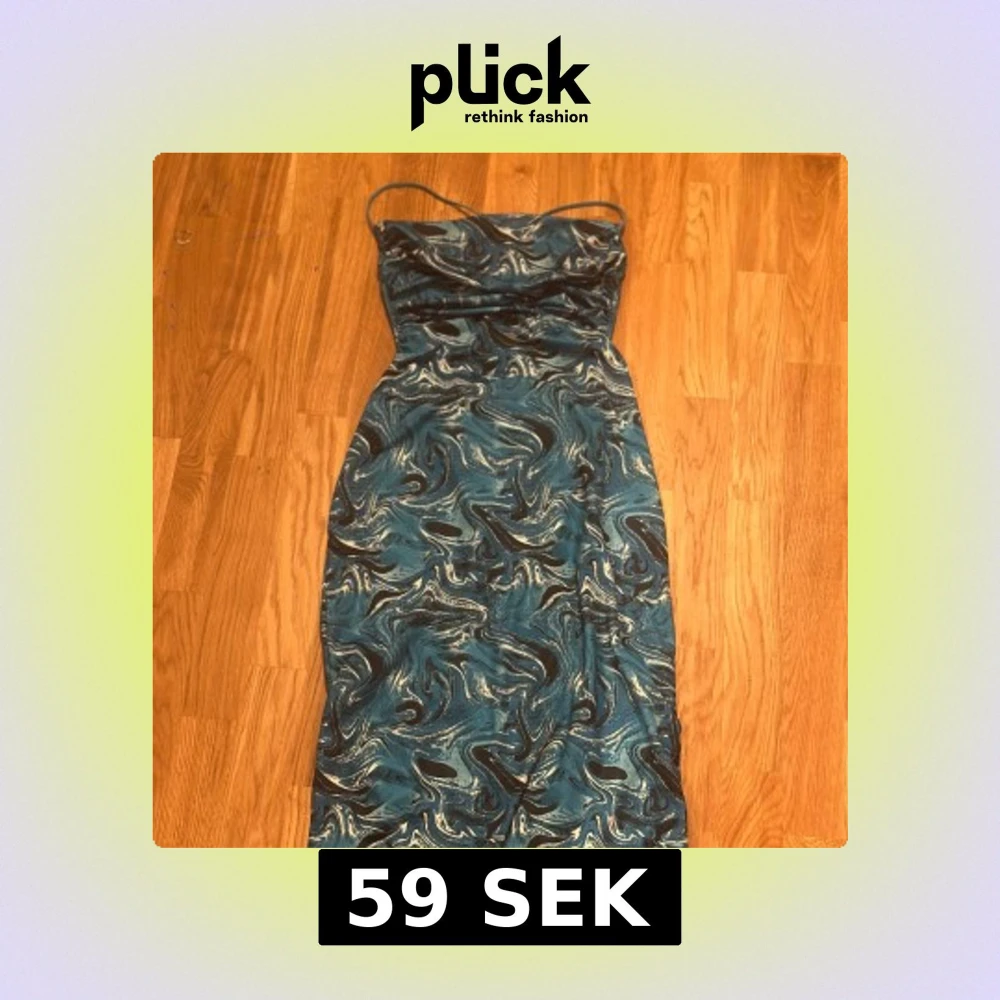 Säljer en långklänning med smala axelband och coolt blått mönster i swirl-stil. Klänningen har figurnära passform och är ärmlös, perfekt för dig som vill sticka ut med en unik look. Materialet känns mjukt och följsamt mot kroppen.