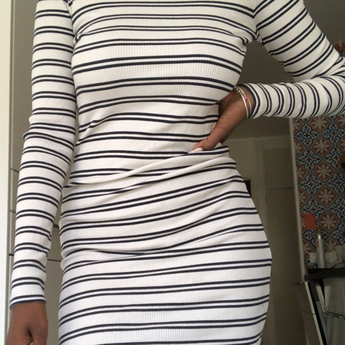 Vit klänning med svarta ränder. Ribbad i tyget. Går att Välja om man vill ha den lite längre eller kortare.