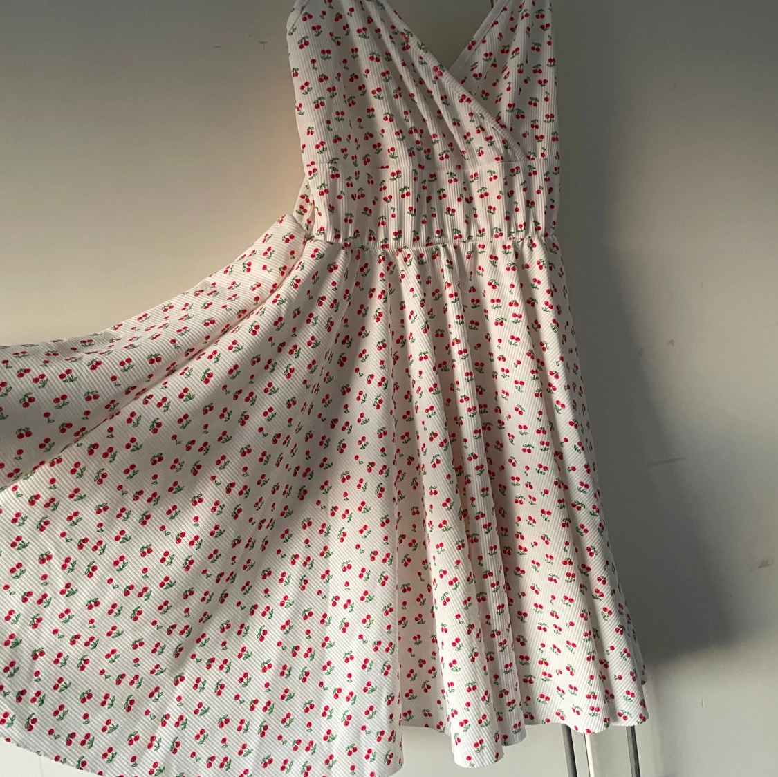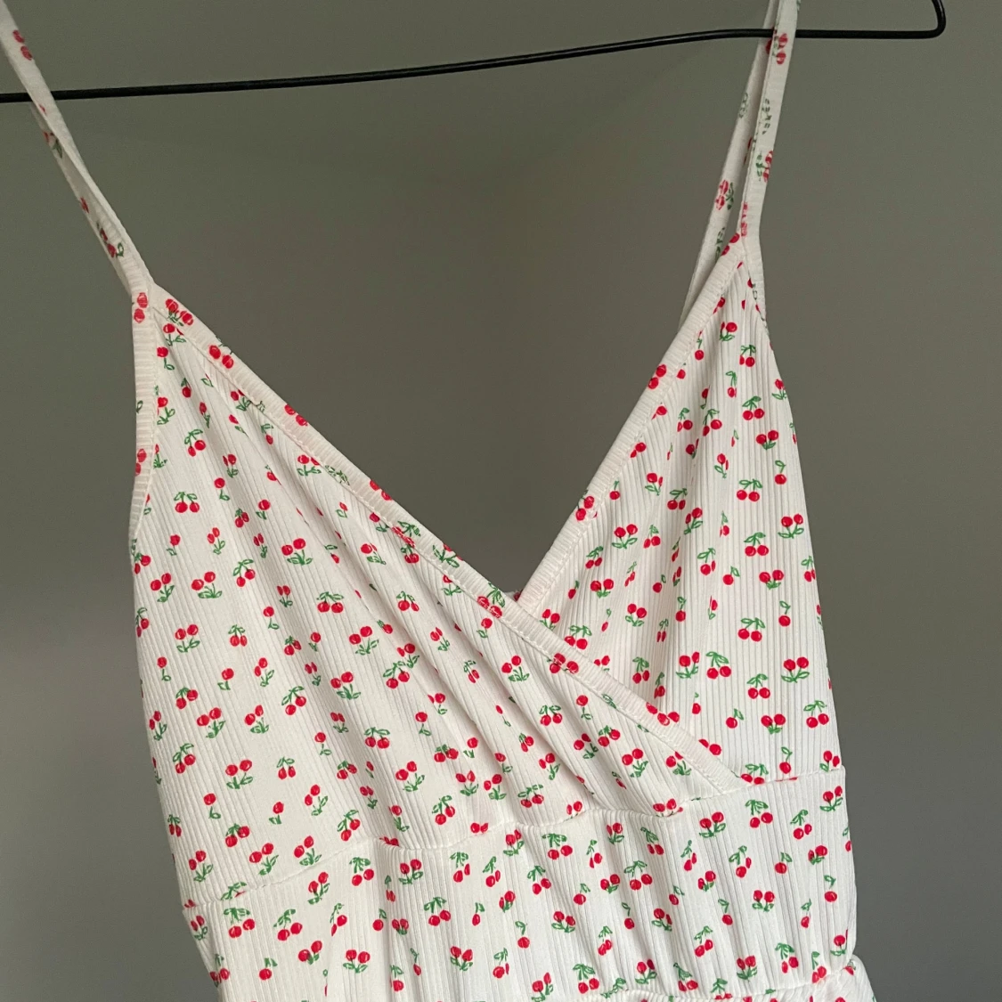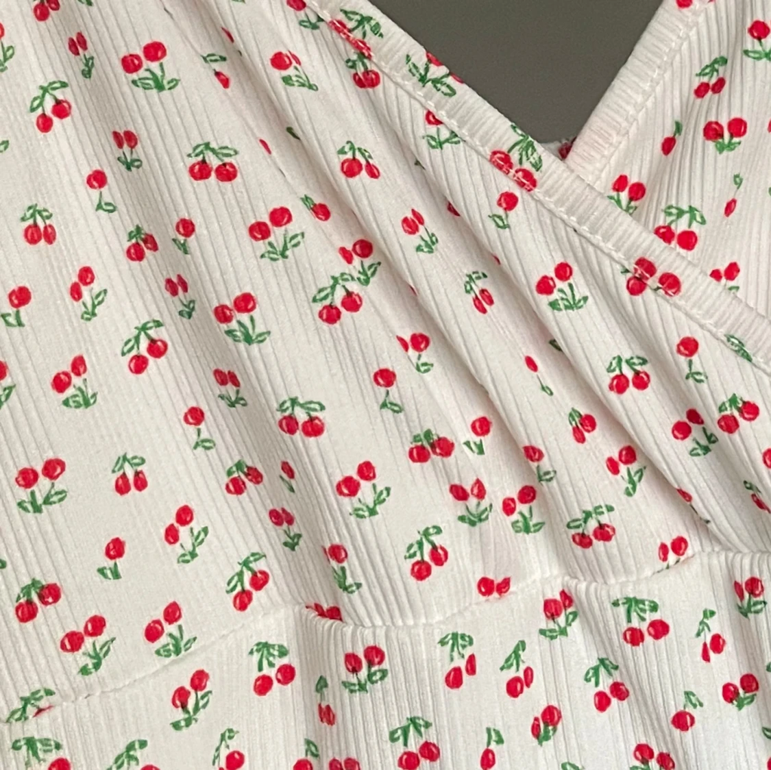Supersöt vit kortklänning med tunna axelband. Klänningen har ett gulligt körsbärsmönster i rött och lätt rynkad midja för en flowy känsla. Perfekt för varma dagar och sommarhäng. Använt endast en gång.