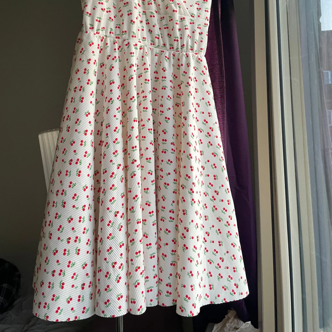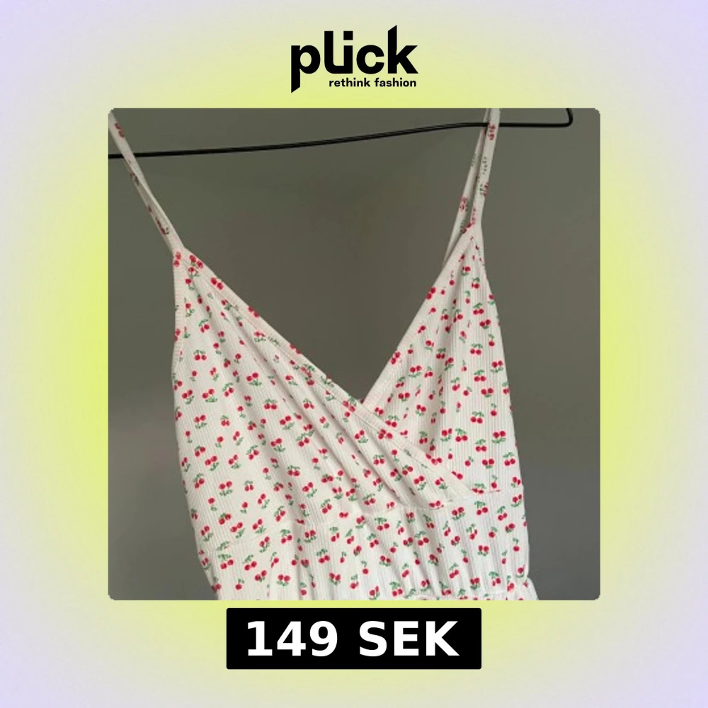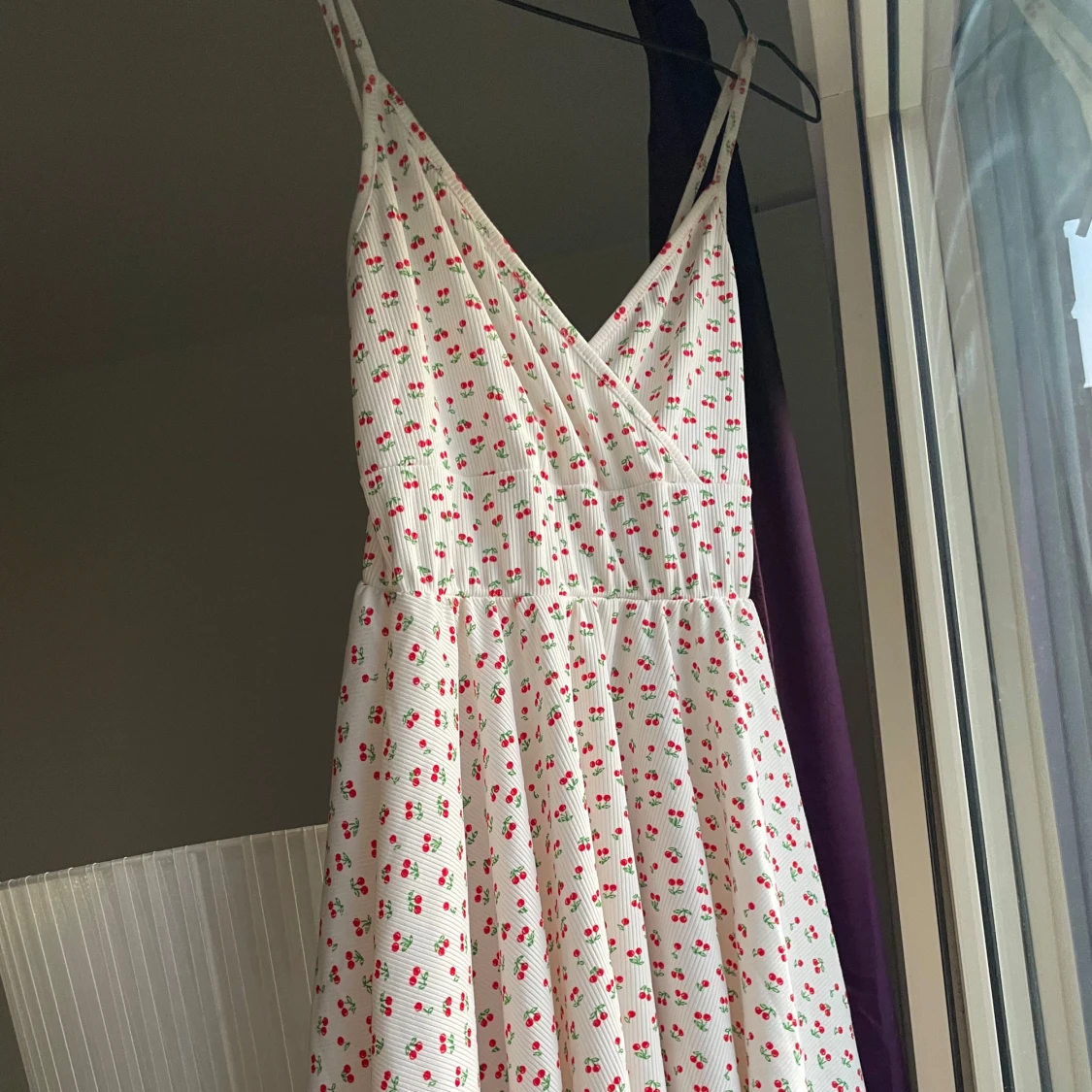 Supersöt vit kortklänning med tunna axelband. Klänningen har ett gulligt körsbärsmönster i rött och lätt rynkad midja för en flowy känsla. Perfekt för varma dagar och sommarhäng. Använt endast en gång.