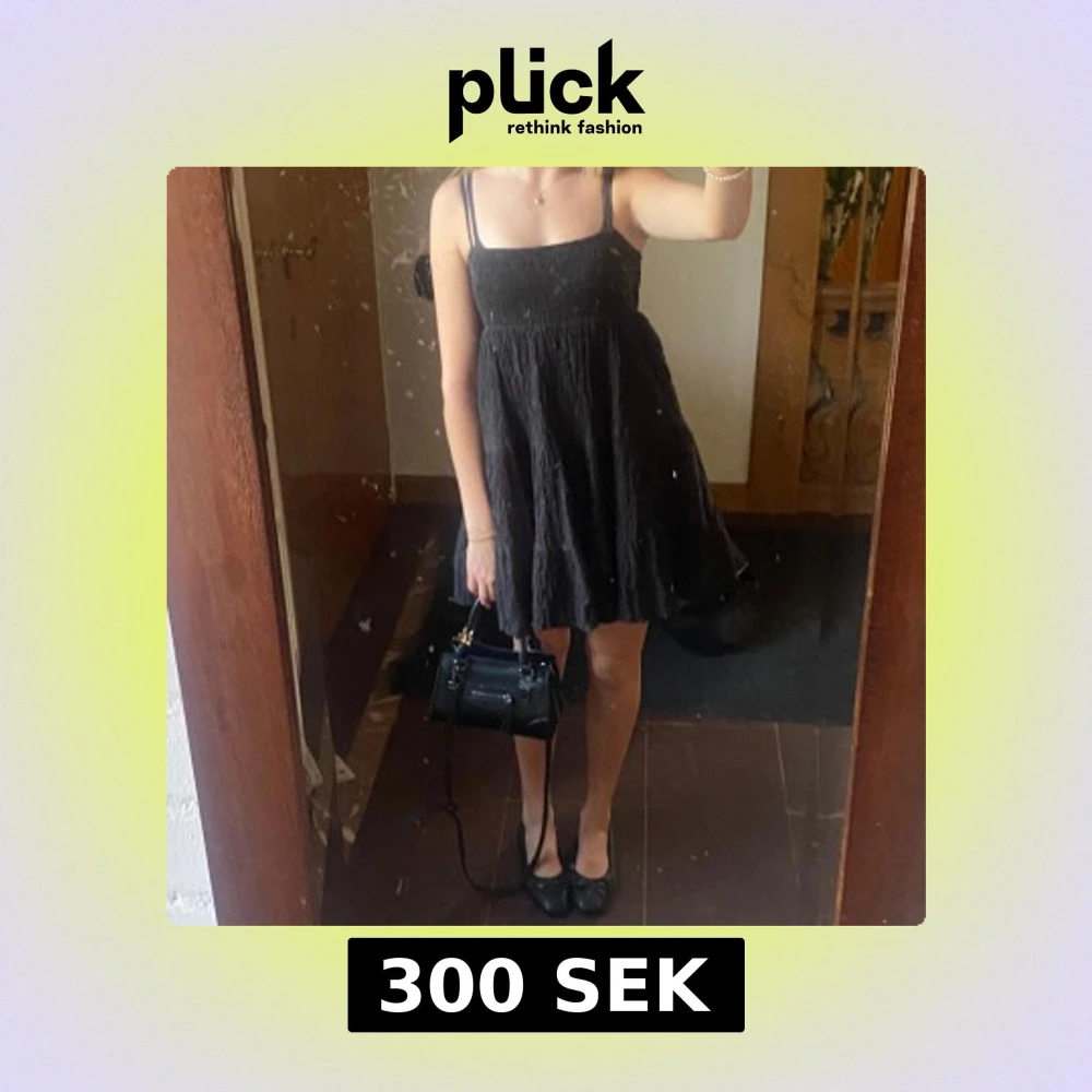 Supersöt svart kort klänning med smockad överdel och tunna axelband. Kjolen är luftig och har en lätt volangig känsla. Perfekt för varma dagar och enkel att styla med accessoarer. Materialet känns mjukt och bekvämt mot huden.
