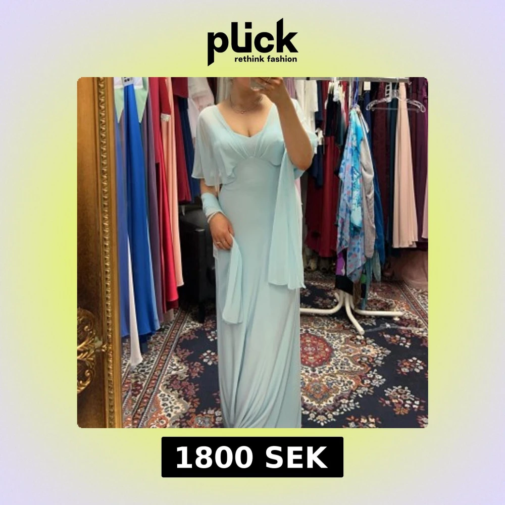 Elegant ljusblå långklänning med v-ringad hals och volangdetaljer. !!nypris 2700kr!!