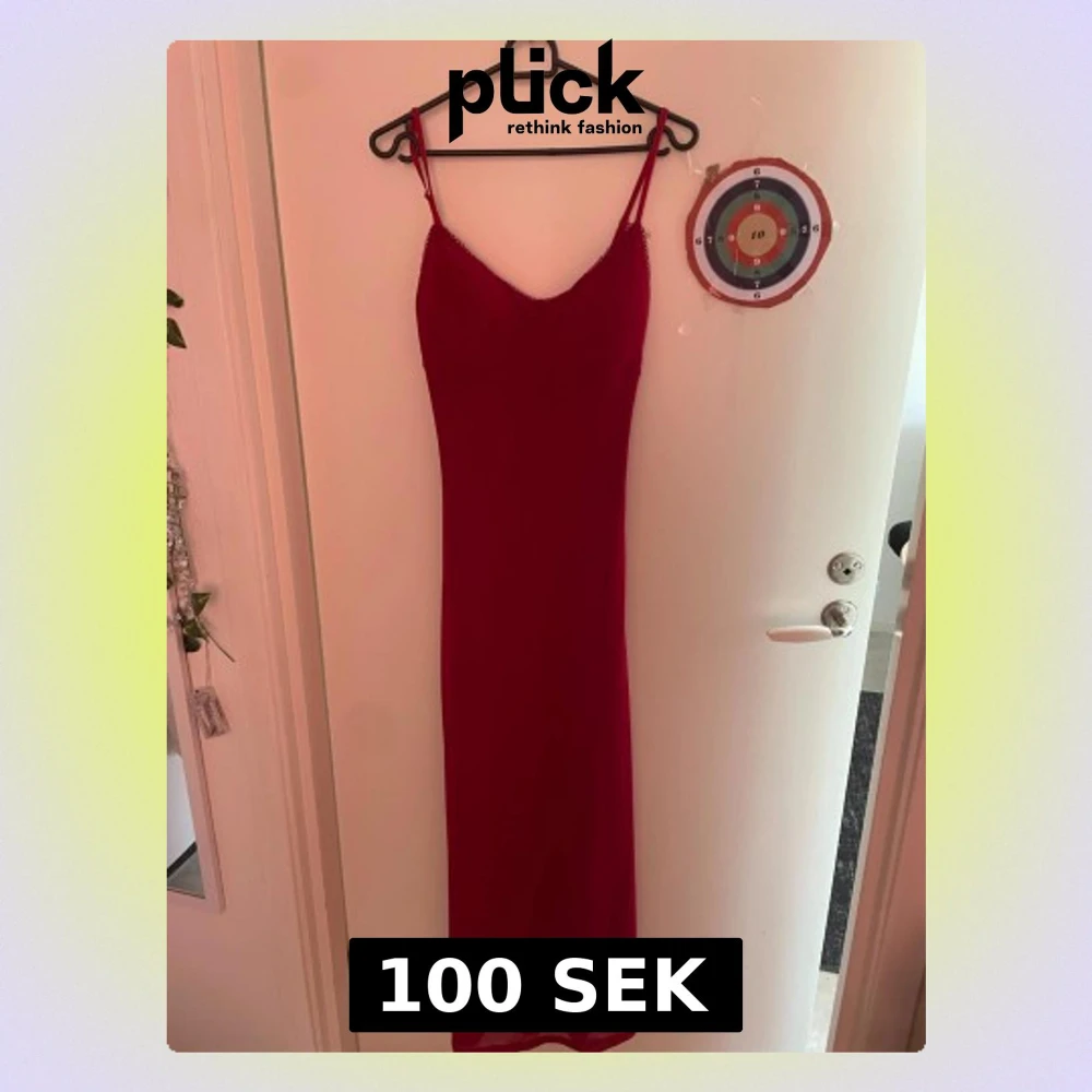 Säljer en röd långklänning med smala axelband. Klänningen har en enkel, stilren design med lätt v-ringad urringning och tunna band. Köpt på shein och endast testad men har haft den i garderoben ett tag. Jätte gullig!!