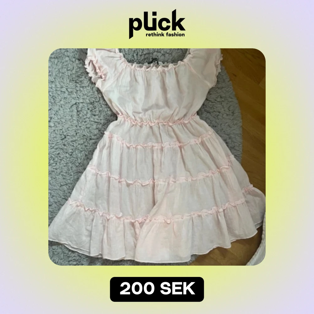 En supersöt ljusrosa klänning med lite puffärmar och stretch i midja och runt halsen, vilket gör så att man även kan ha den som en Off soulder. 🩷🩷Står ingen storlek men skulle säga M/L, kan passa S också. Ser ut som linne material men det står inte.🩷