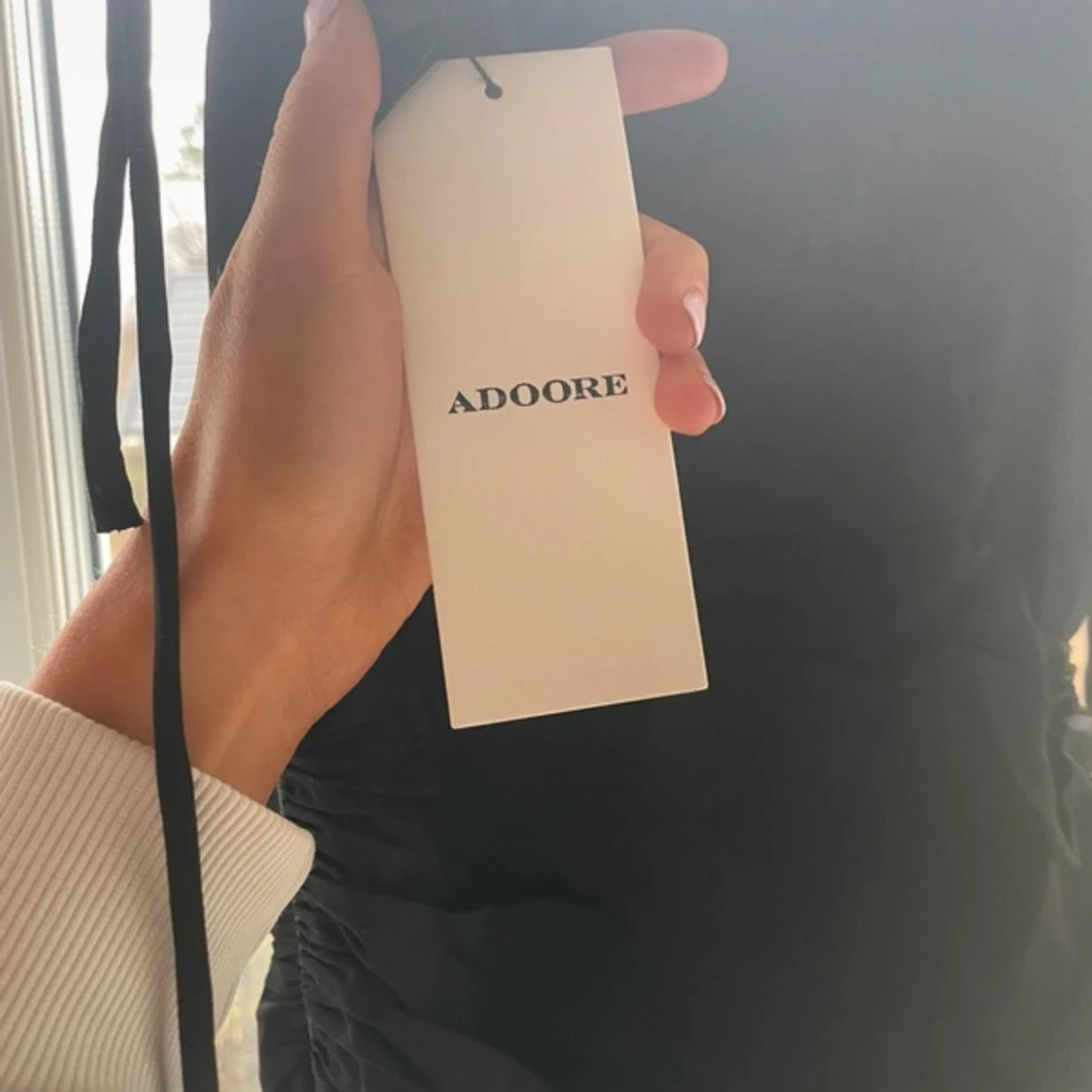Supersnygg svart klänning från Adoore med smala axelband som knyts på axlarna. Rynkade detaljer längs sidorna och en dragkedja för att få en figurnära passform. Sitter så himla fint och väldigt smickrande på kroppen. Helt ny och nypris 1800kr💖🌸 pris kan diskuteras