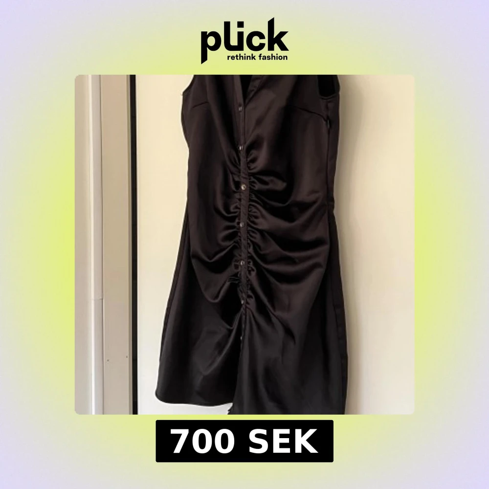 Elegant svart ärmlös klänning med knappar framtill och rynkdetaljer som ger en smickrande passform. Perfekt för en stilren look.