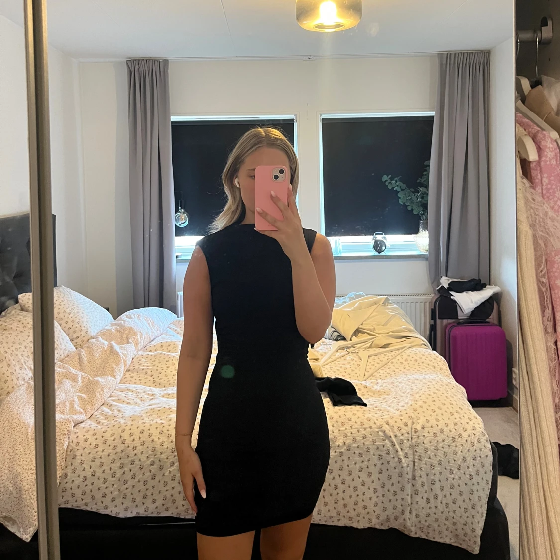 Säljer en svart, tight och ärmlös kortklänning med rund hals. Klänningen har en enkel och stilren design som sitter snyggt på kroppen. Perfekt för dig som gillar minimalistisk stil och vill ha en klänning som känns både trendig och klassisk.