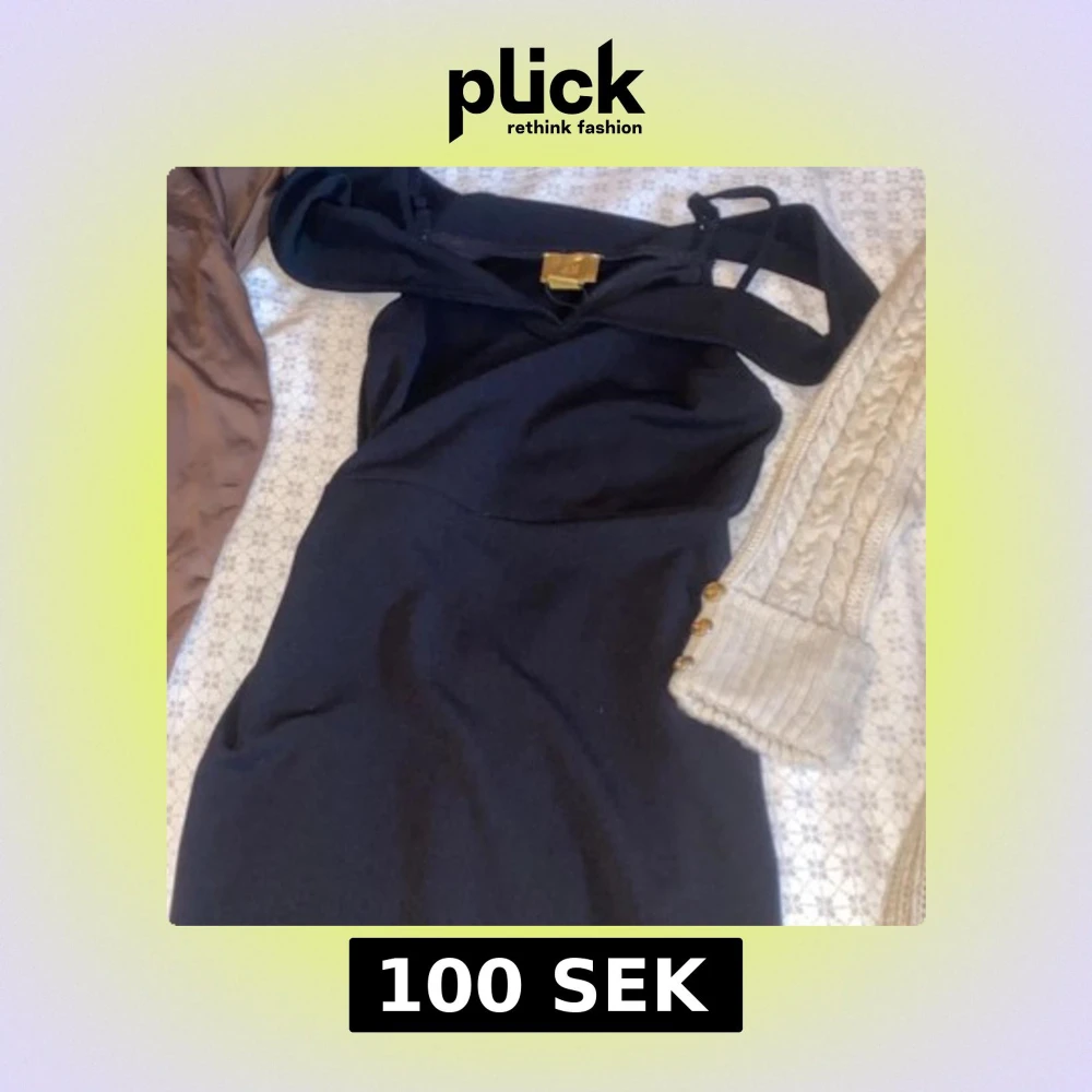Snygg svart klänning med axelbandslös design och stilren siluett. Klänningen har en elegant form och ett guldfärgat spänne framtill som detalj. Perfekt för dig som gillar minimalistisk och chic stil. Passar dig som vill sticka ut med en klassisk look.