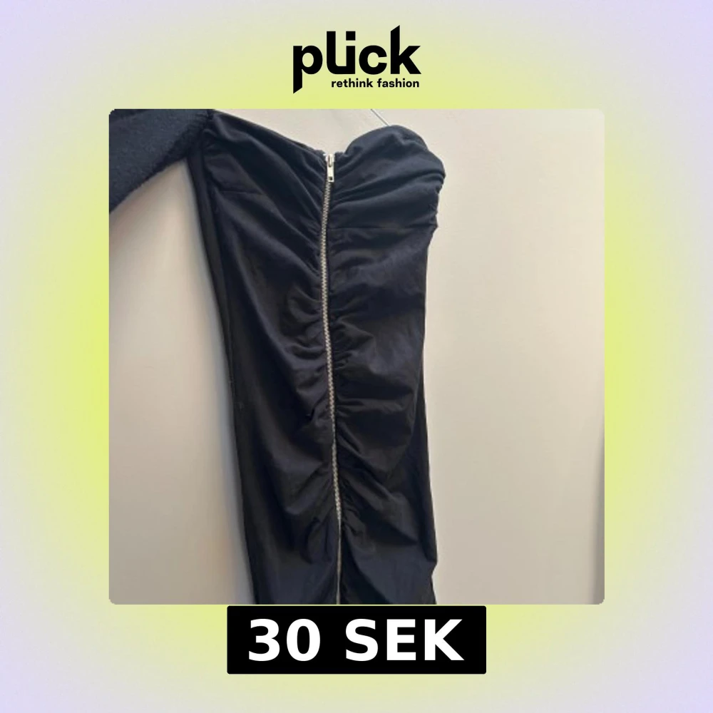 Snygg svart axelbandslös kortklänning med dragkedja framtill och rynkade detaljer längs hela klänningen. Perfekt för dig som vill sticka ut med en edgy look. Figurnära passform och cool design.