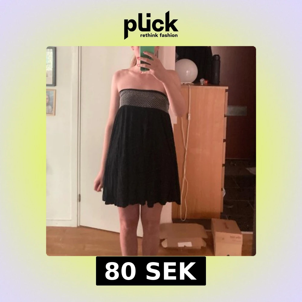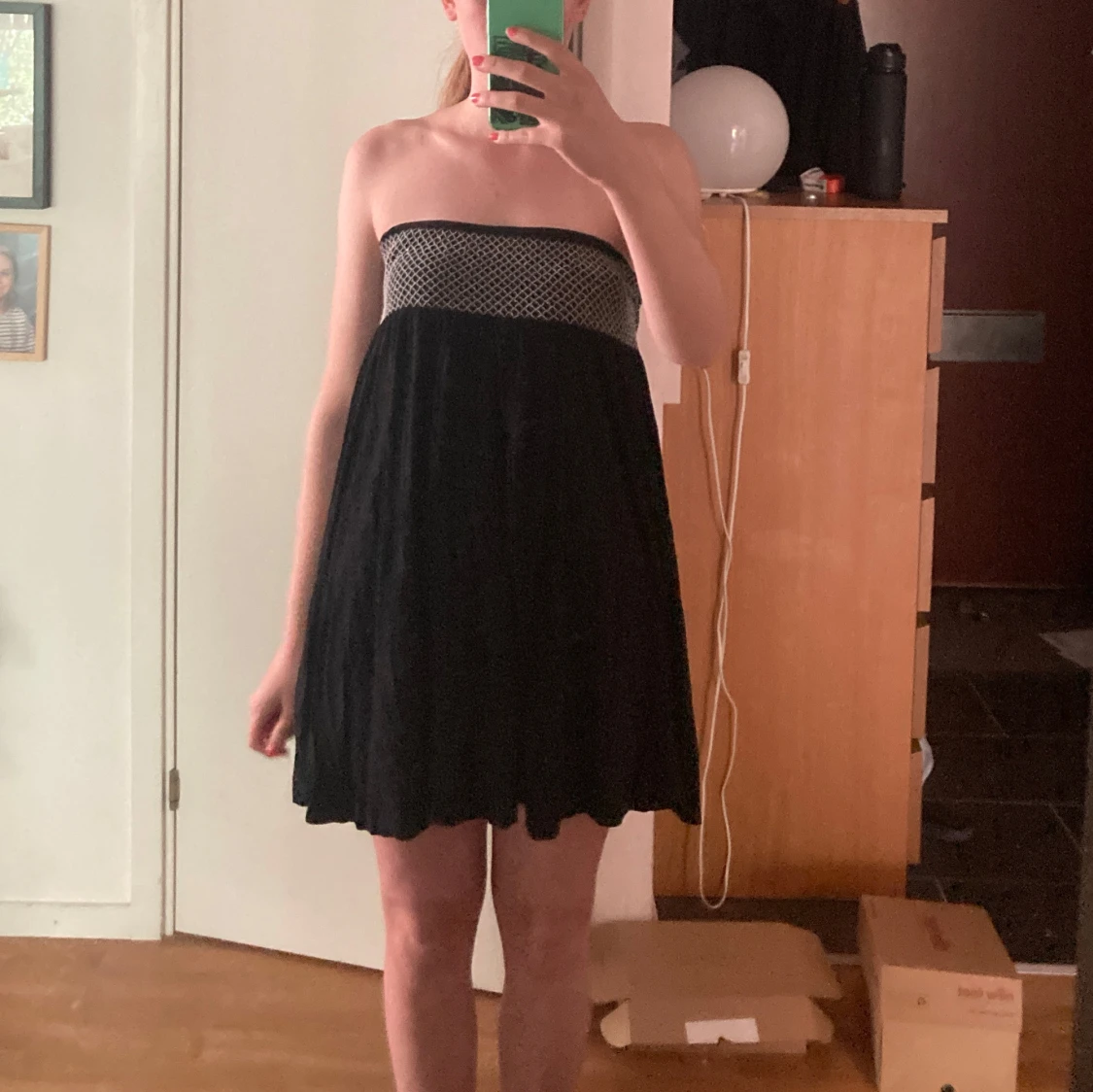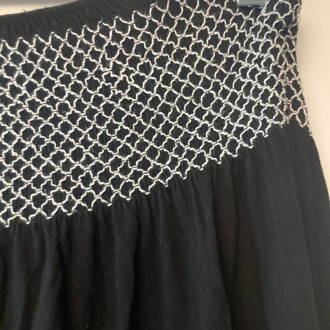 Svart axelbandslös kortklänning med smockad överdel i vitt broderat mönster. Klänningen har en luftig och flowy passform, perfekt för varma dagar. Den är i storlek M och kan användas både som klänning samt kjol.