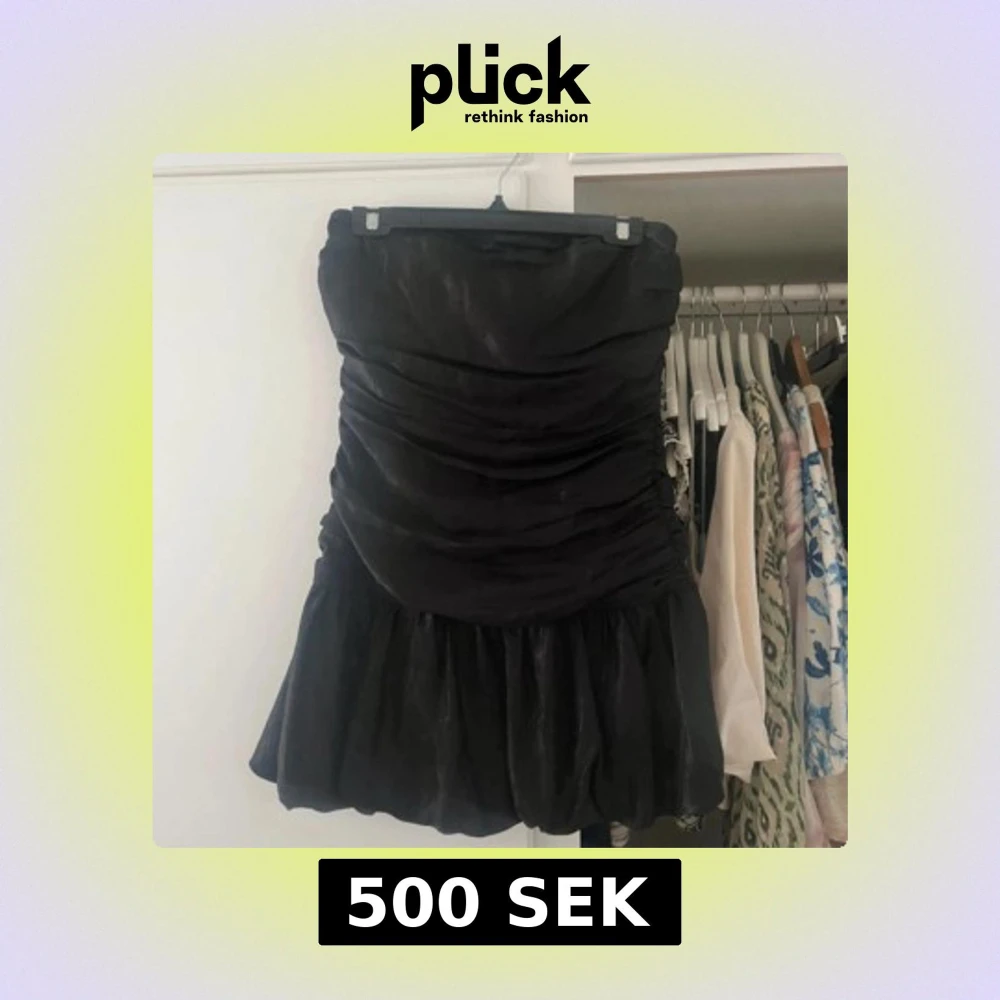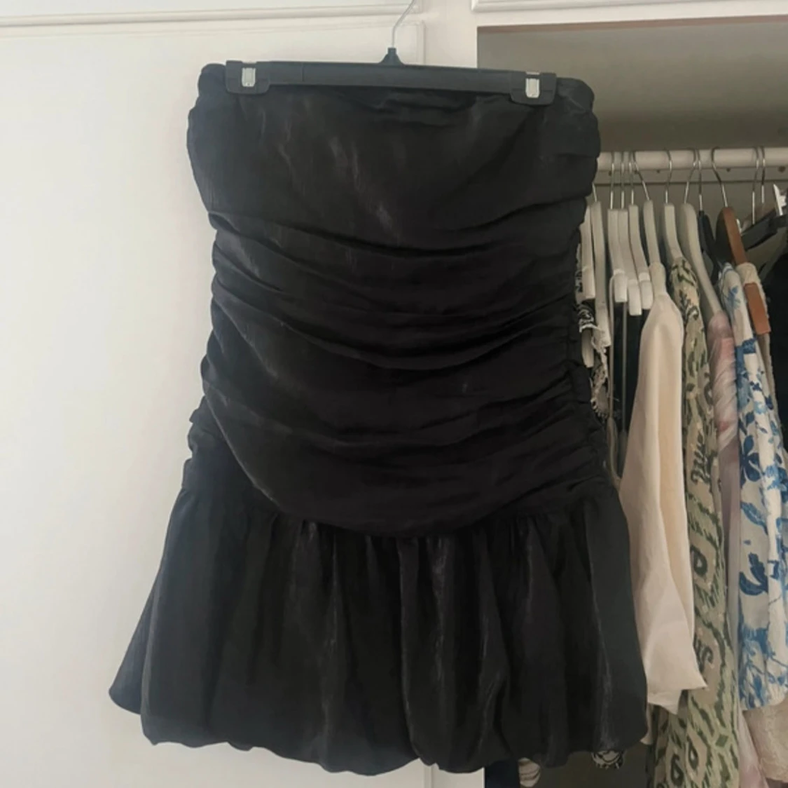 Supersnygg svart axelbandslös kortklänning från MNG. Klänningen har en tight passform upptill, draperad midja och volangig kjol. Använd en gång så den är precis som ny! Storlek XS men passar även en S🤗köpt för 799kr