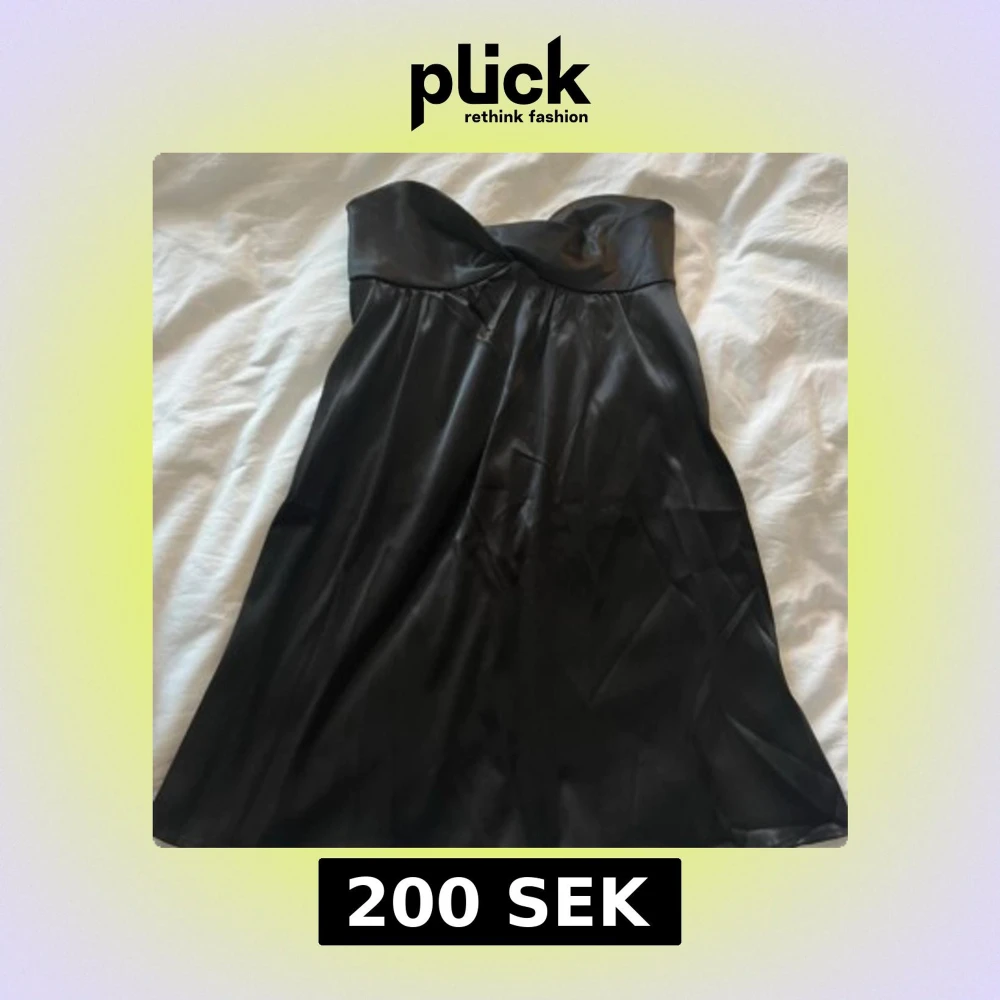 Säljer en svart axelbandslös klänning i glansigt satinmaterial. Klänningen har en snygg twist-detalj vid bysten och en lätt utställd passform. Perfekt för dig som vill ha en stilren och elegant look.