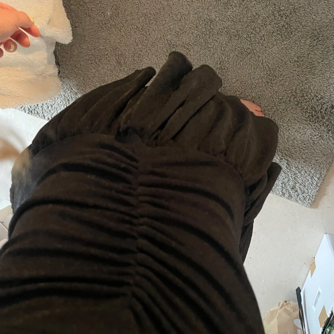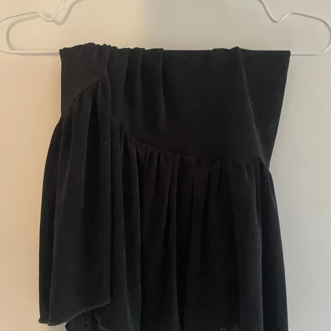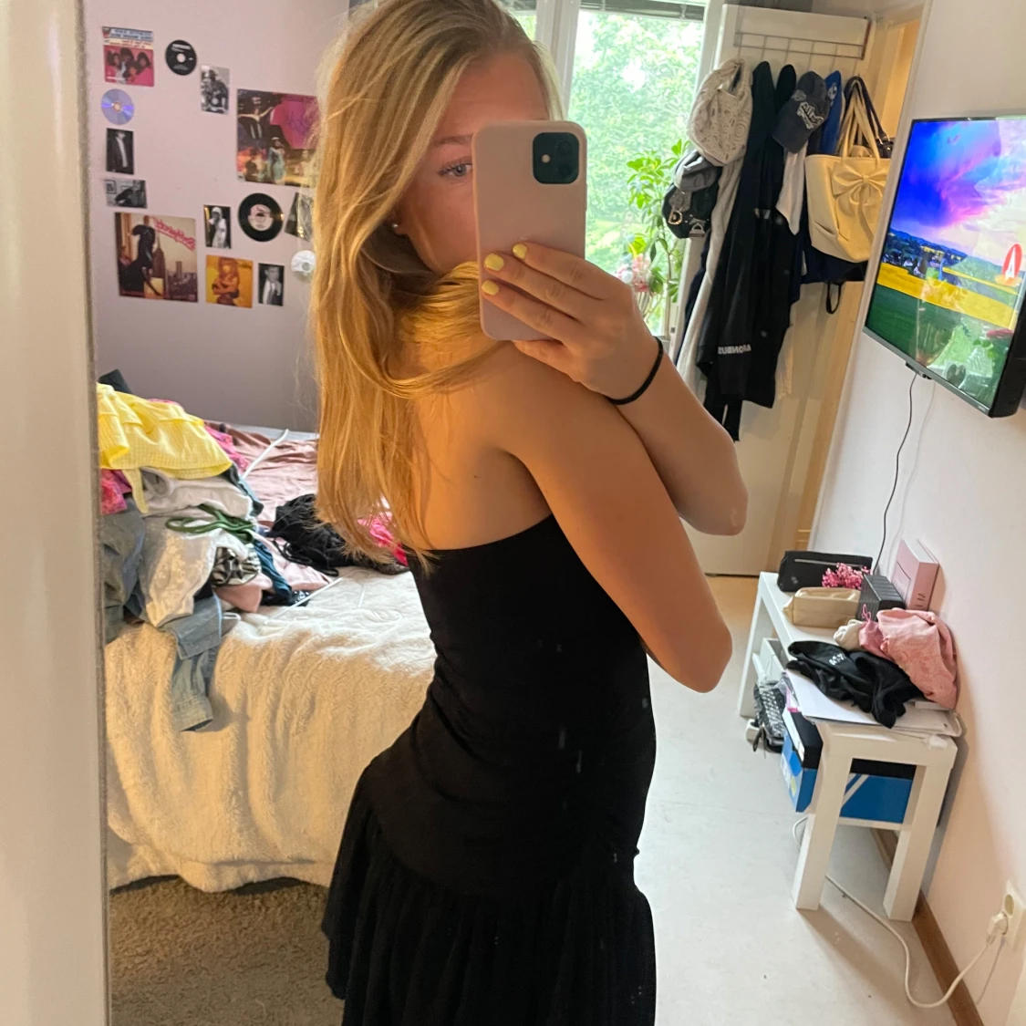 Säljer en svart axelbandslös kortklänning med volang nertill och snygg rynkdetalj längs sidan. Klänningen har en tight passform upptill och är tillverkad i ett mjukt, stretchigt material som känns bekvämt mot huden.