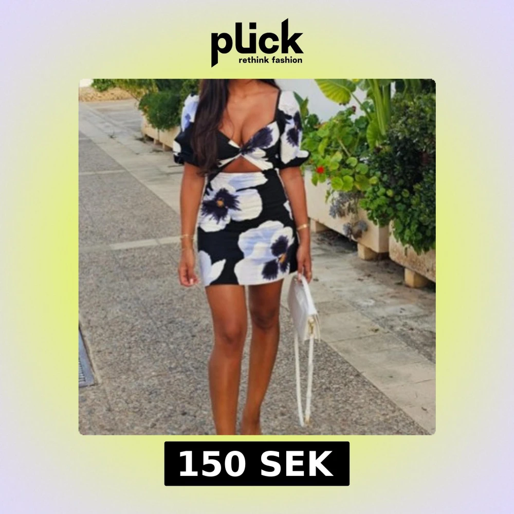 Supersnygg svart kortklänning med stora vita och lila blommor, puffiga kortärmar och trendig cut-out vid midjan. Klänningen har omlott-detalj framtill och en tight passform som framhäver figuren. Perfekt för dig som vill sticka ut med en cool och feminin look.